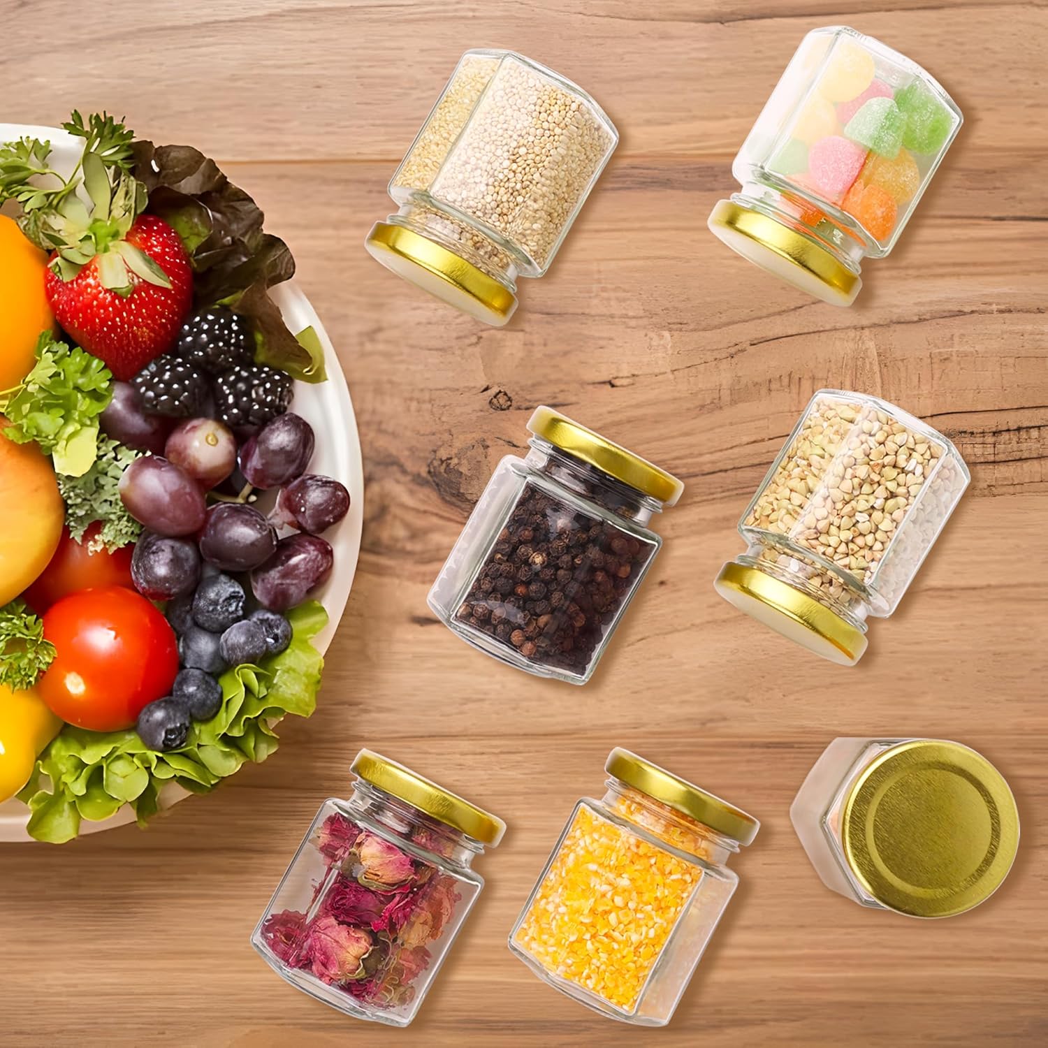 - Easy to Clean These Transparent: 3oz glass honey jars are elegantly designed,allowing you to clearly distinguish the contents,Hexagonal canisters are attractive and easy to store,saving you space,Easy to clean up with water and soaps,hussle free