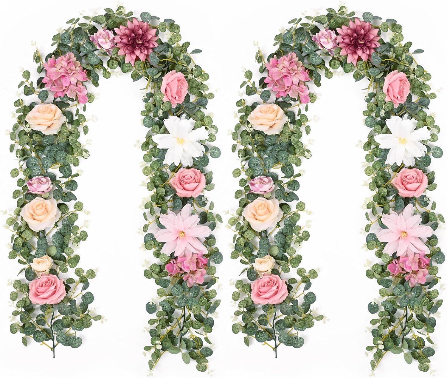Waipfaru 2Pcs Artificial Flower Garland Decorations, 12.14Ft Eucalyptus Greenery Vines with Pink Roses for Wedding Table Runner Centerpieces Backdrop Room Decor (Pink)