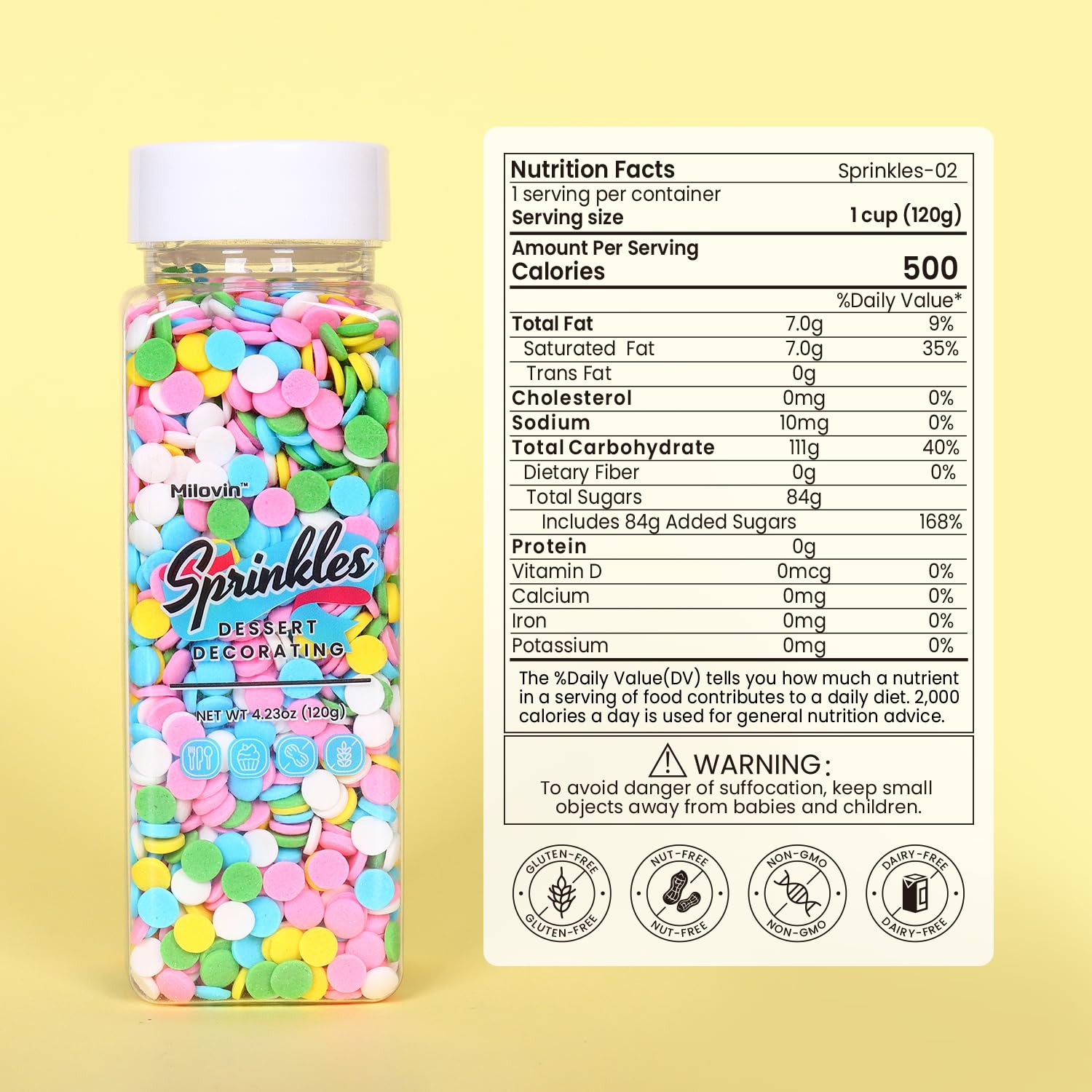 - High Quality and Safe: Made with food-grade ingredients. Edible, Gluten-free, Nut-free, Dairy-free, Non-GMO. Our pastel confetti sprinkles meet American food standards and guard your and your family's health.