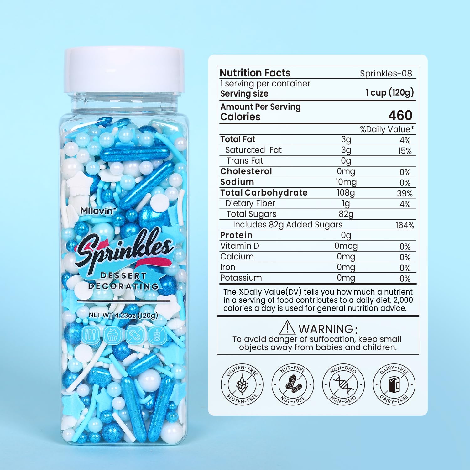 - High Quality and Safe: Made with food-grade ingredients. Gluten-free, Nut-free, Dairy-free, Non-GMO. Our blue sprinkles meet American food standards and guard your and your family's health.