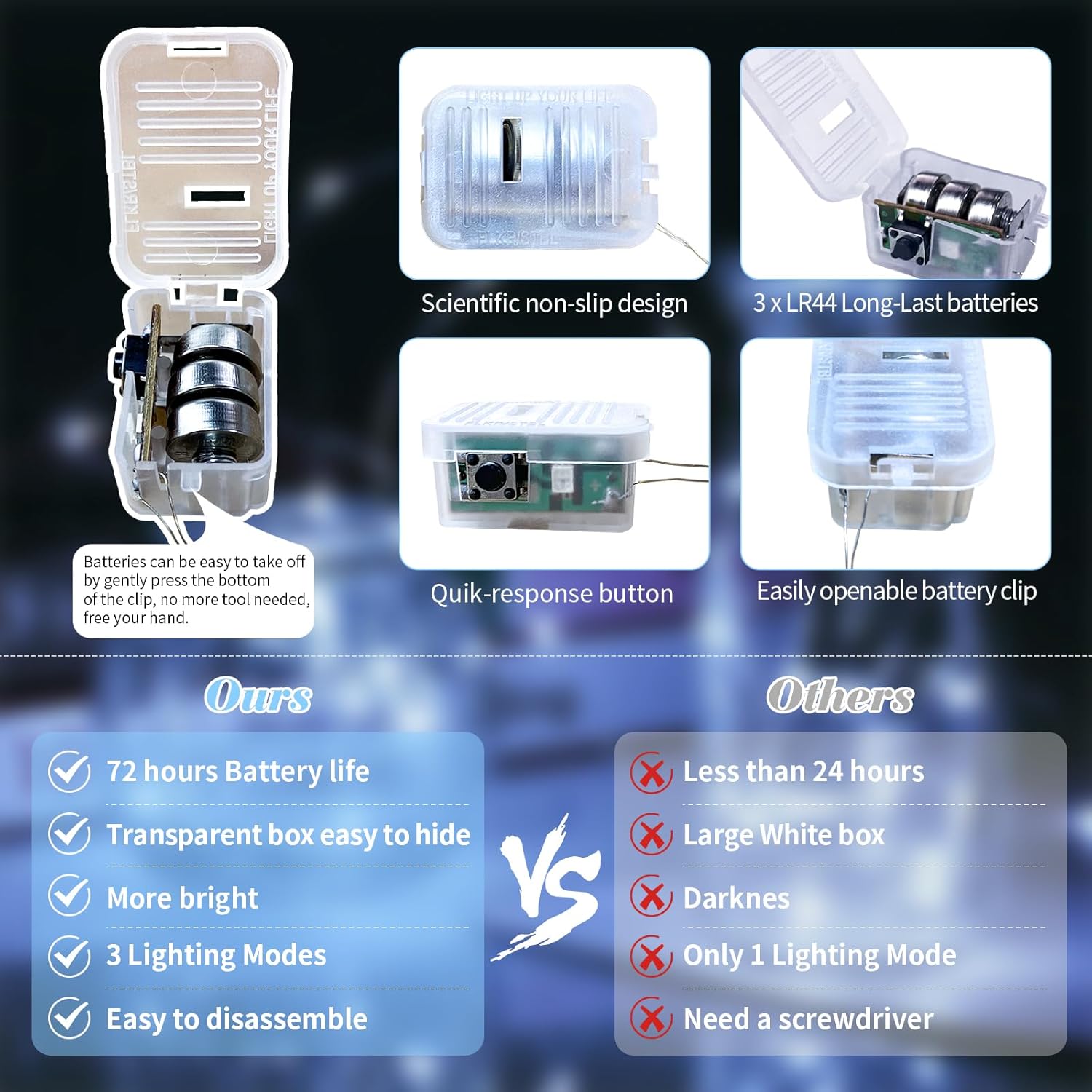 - UPGRADED DESIGH AND EASY TO REPLACE: The fairy lights' newest clear and small battery box is 0.78*1.26 inches in size, very easy to hide into all your DIY projects. The upgraded battery pack has scientific non-slip design on both sides, which makes it feel comfortable and easy to catch. Batteries are also very easy to take off, no more screwdriver needed, just gently press the bottom of the clip to open, free your hand