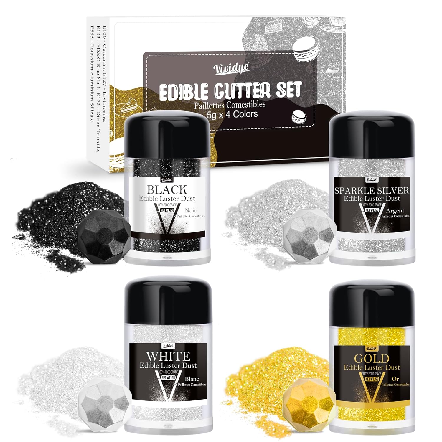 - FANCY EDIBLE LUSTER DUST - 100% edible food-grade glitter powder is specially crafted for food decoration and crafts industry, providing a metallic finish or adding a gilded effect to beverages and food. Discover an unlimited world of vibrant metallic color with our sparkling edible luster dust powder.