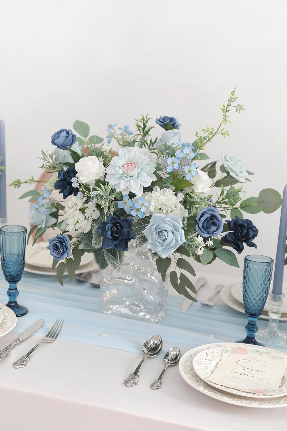 - Package Details- 3.9 inch Foam Peony x1pcs,2.7inch high-centered rose x4pcs,2.75 inch gardenia x2pcs,3.7 inch hybrid tea rose x2pcs,Foam Rose x5pcs,Silk dahlia x2pcs,Silk Rose x2pcs,hydrangea x4pcs,some greeneries of Silver Dollar Eucalyptus leaves,Willow/ Leaf,babys breath artificial flowers; etc.