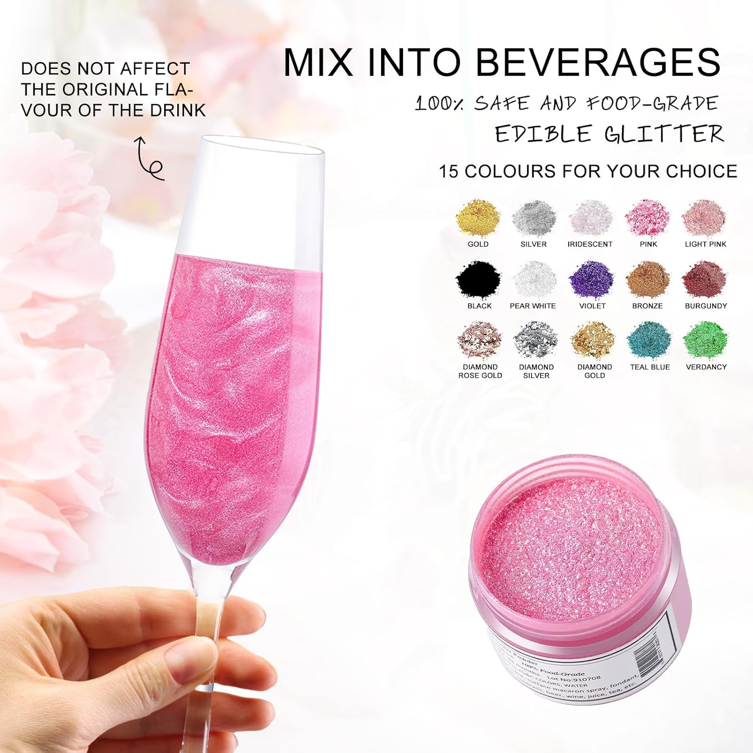 - TASTELESS GLITTER DUST: Our edible glitter is tasteless and adds a gorgeous shine to your baking, with a wide range of colors to choose from. Edible sprinkles powder is perfect for festive events such as parties, family dinners, and social gatherings. Experience the fun and simplicity of using food-grade glitter with your favorite beverages & food!