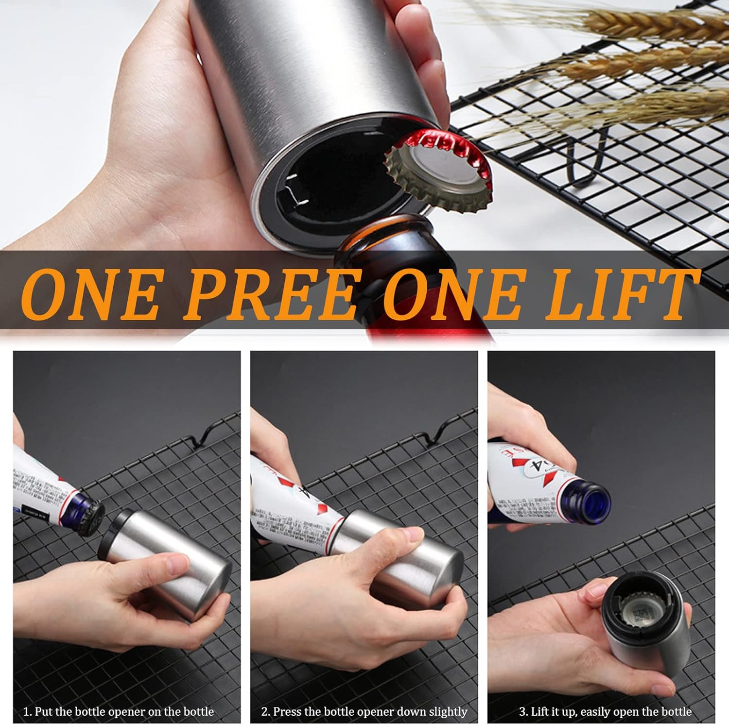 - GREAT GIFTS CHOICE - Don't know what gifts to give? Please choose this automatic stainless steel magnetic bottle opener, which not only has a delicate and fashionable appearance, but also very firm and sturdy. This innovative pop off bottle opener has already become popular gifts for (beer zealots)bottle cap collectors. At the same time, pop top bottle opener is also a practical accessory that can be used in various occasions. If you need a unique and practical gifts, we recommend this to you!