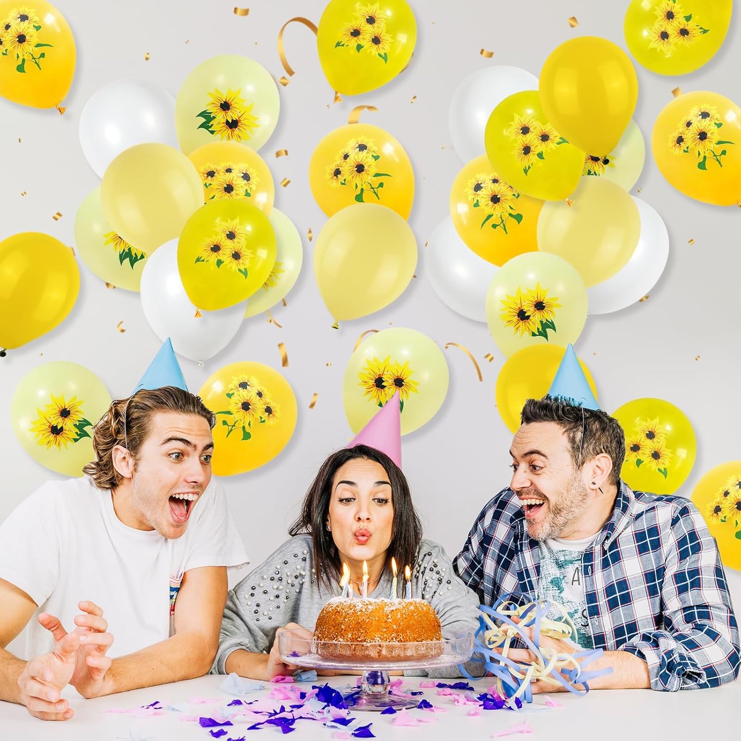 - 12 Inch sunflower balloons: Package content includes 15 pcs sunflower balloons, 5 pcs yellow balloons, 5 pcs pastel yellow balloons,5 pcs white balloons, a balloon ribbon.The color combination meets all your party imagination.