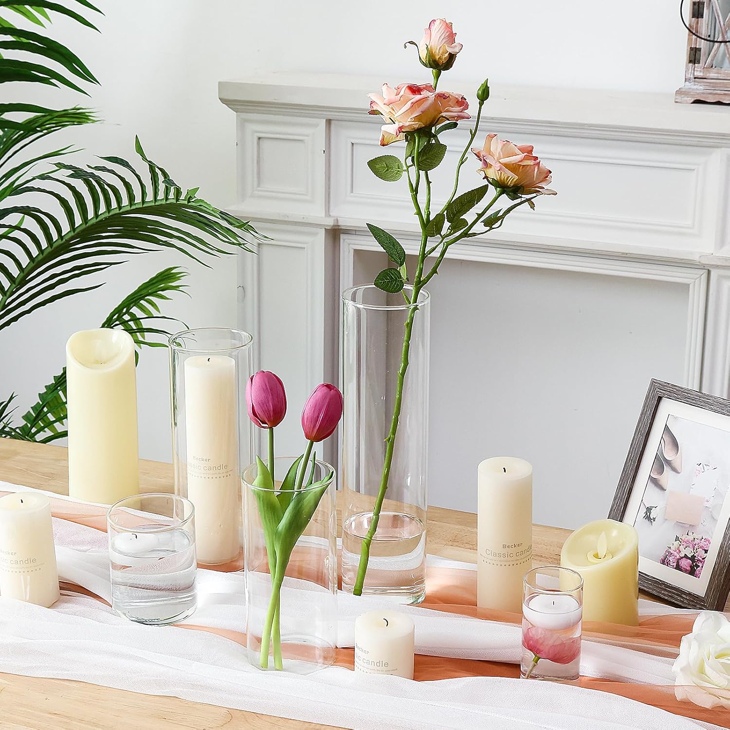 - Product contains: 12 glass cylinder vases, the diameter of the vases is 3.15 inches, and different heights are 4, 6.8, 9, and 11.8 inches, with 4 sizes for various combinations, the vase set is not only fit for flowers but also can used as floating candle holders. For reference, the smallest vase is about the same size as a beverage can, perfect for floating candles, while the taller vase is more suitable for bouquets.