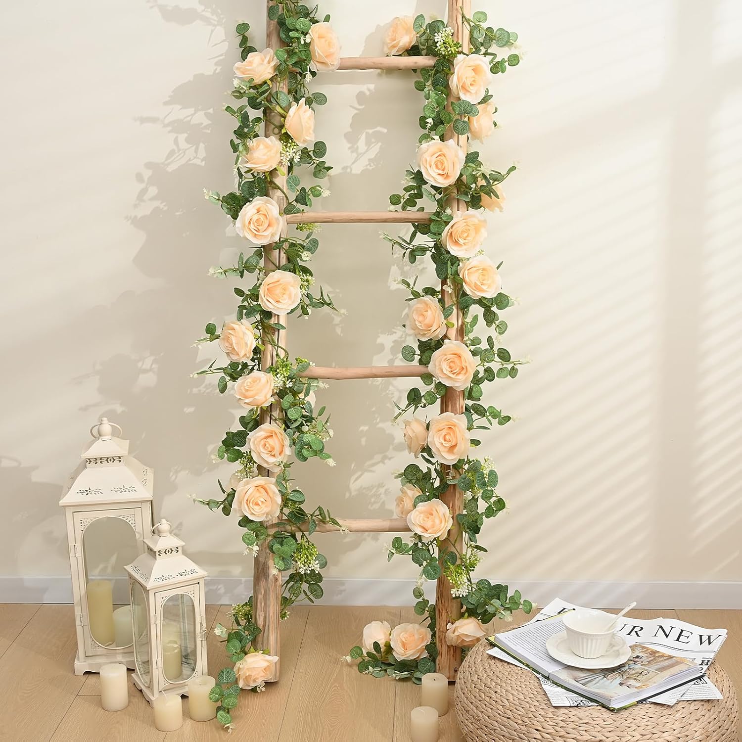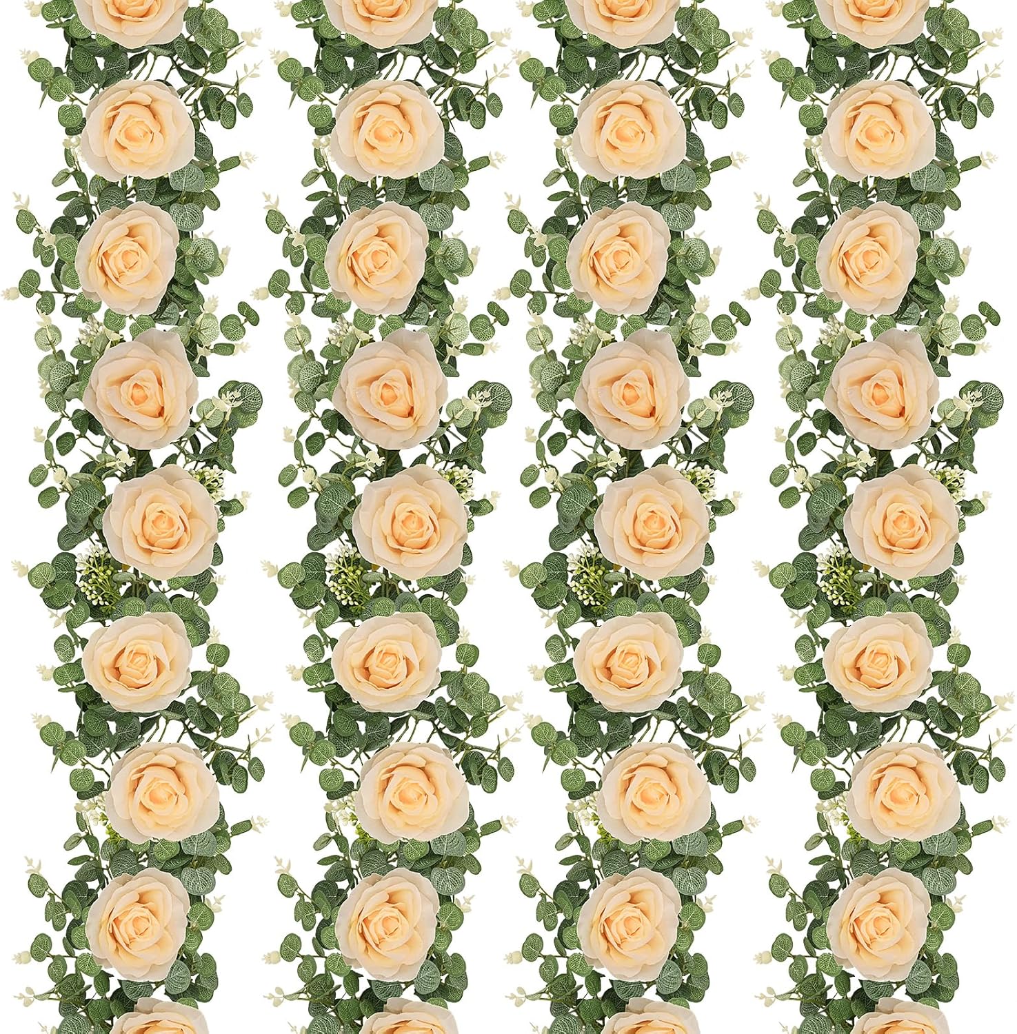 - 🌹PACKAGE INCLUDES: The package includes 4 Pcs artificial eucalyptus garland with flowers. Each piece of flower vine is 6.5Ft/2M long and decorated with 8 champagne roses, eucalyptus leaves and seeds. There are also many small plastic rings distributed on the vine for easy hanging. You can easily trim or bend the shape according to your own preferences and decorative needs.