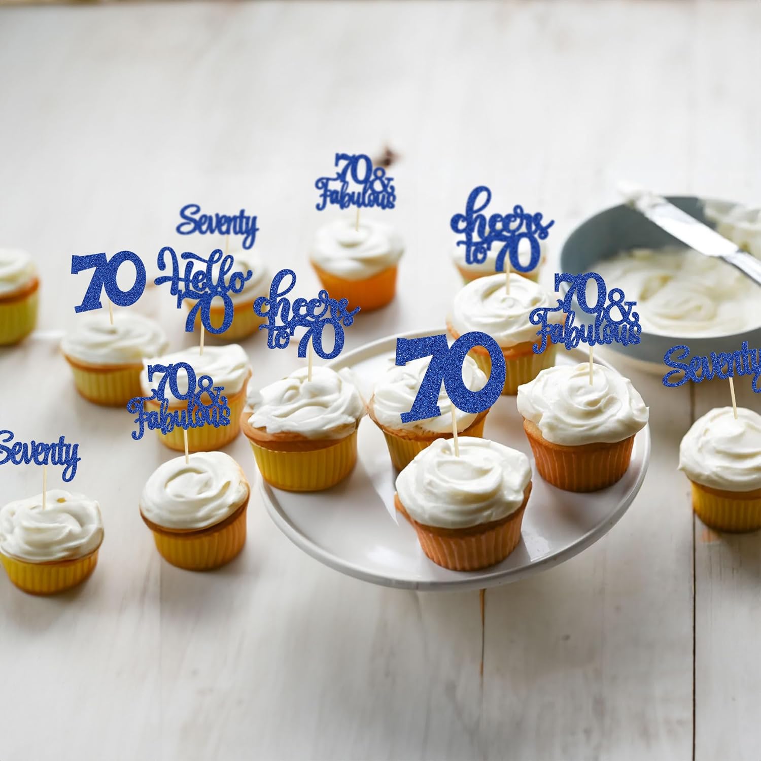 30Pcs Happy 70th Birthday Cupcake Toppers Seventy Cheers to 70 Years Old Birthday Cupcake Picks for 70th Birthday Anniversary Party Cake Decorations Supplies Deep Blue Glitter