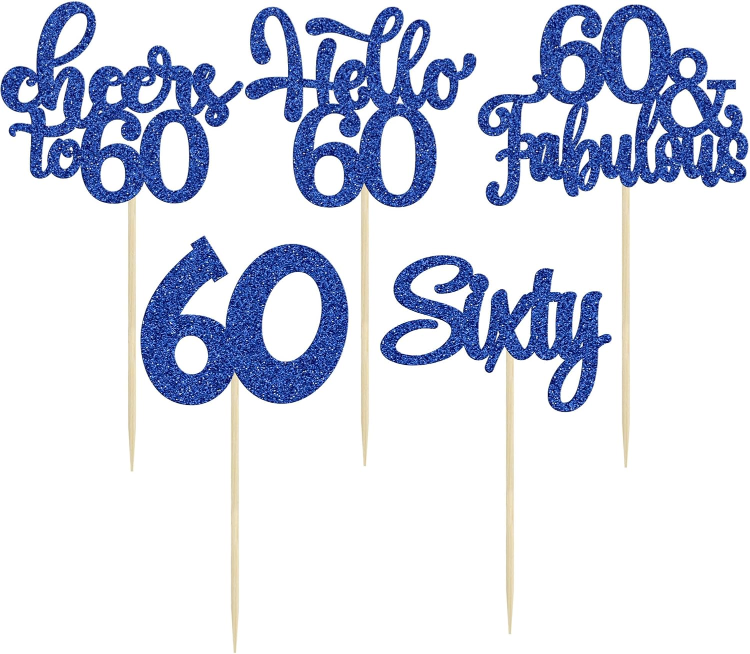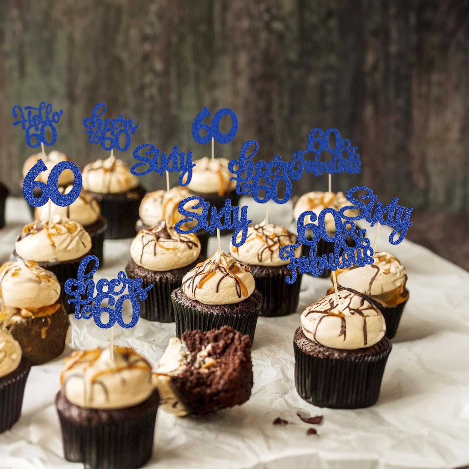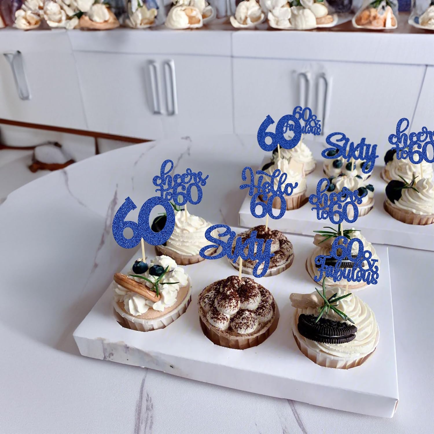 30Pcs Happy 60th Birthday Cupcake Toppers Deep Blue Glitter Sixty Cake Toppers Cheers to 60 Years Old Birthday Cupcake Picks for 60th Birthday Anniversary Party Cake Decorations Supplies