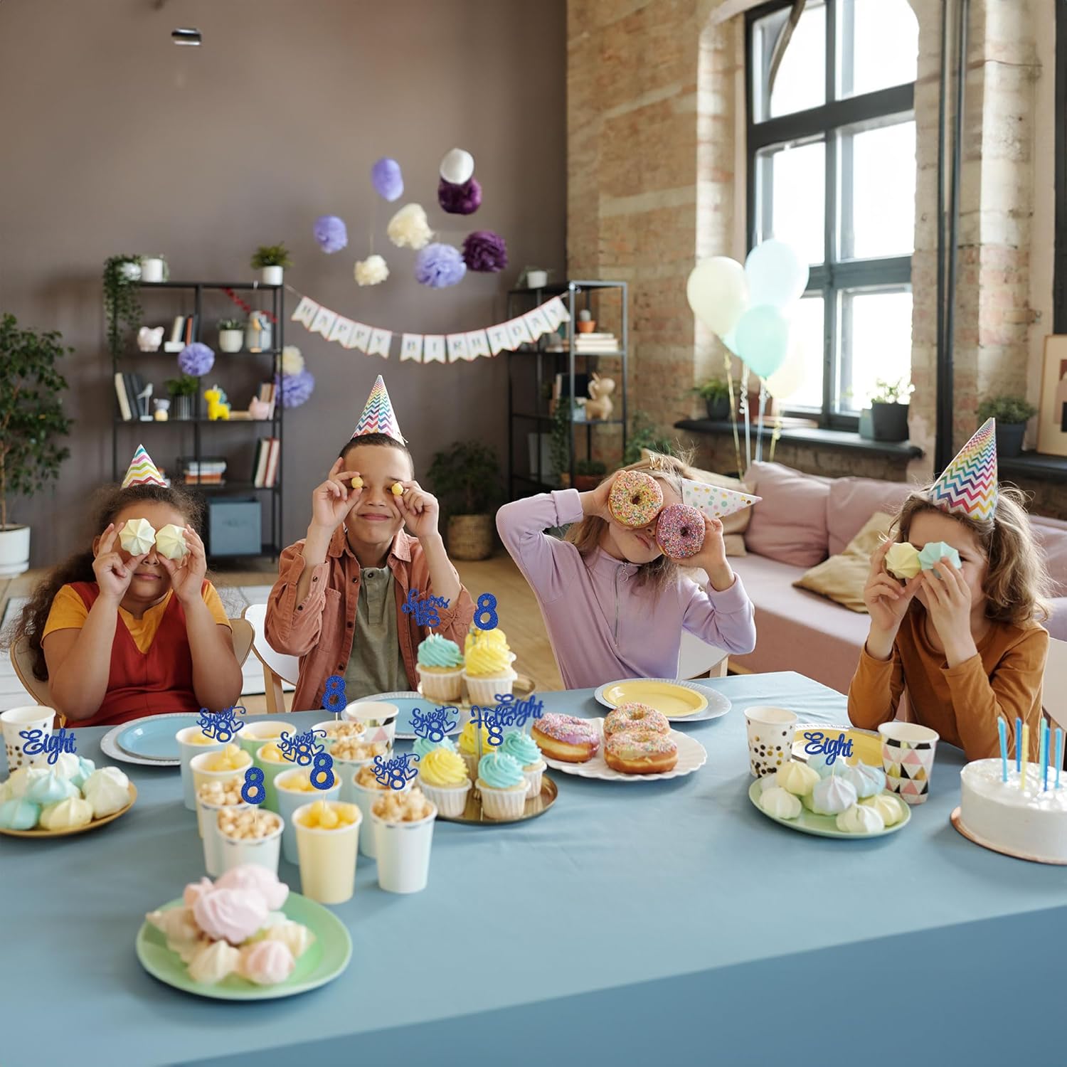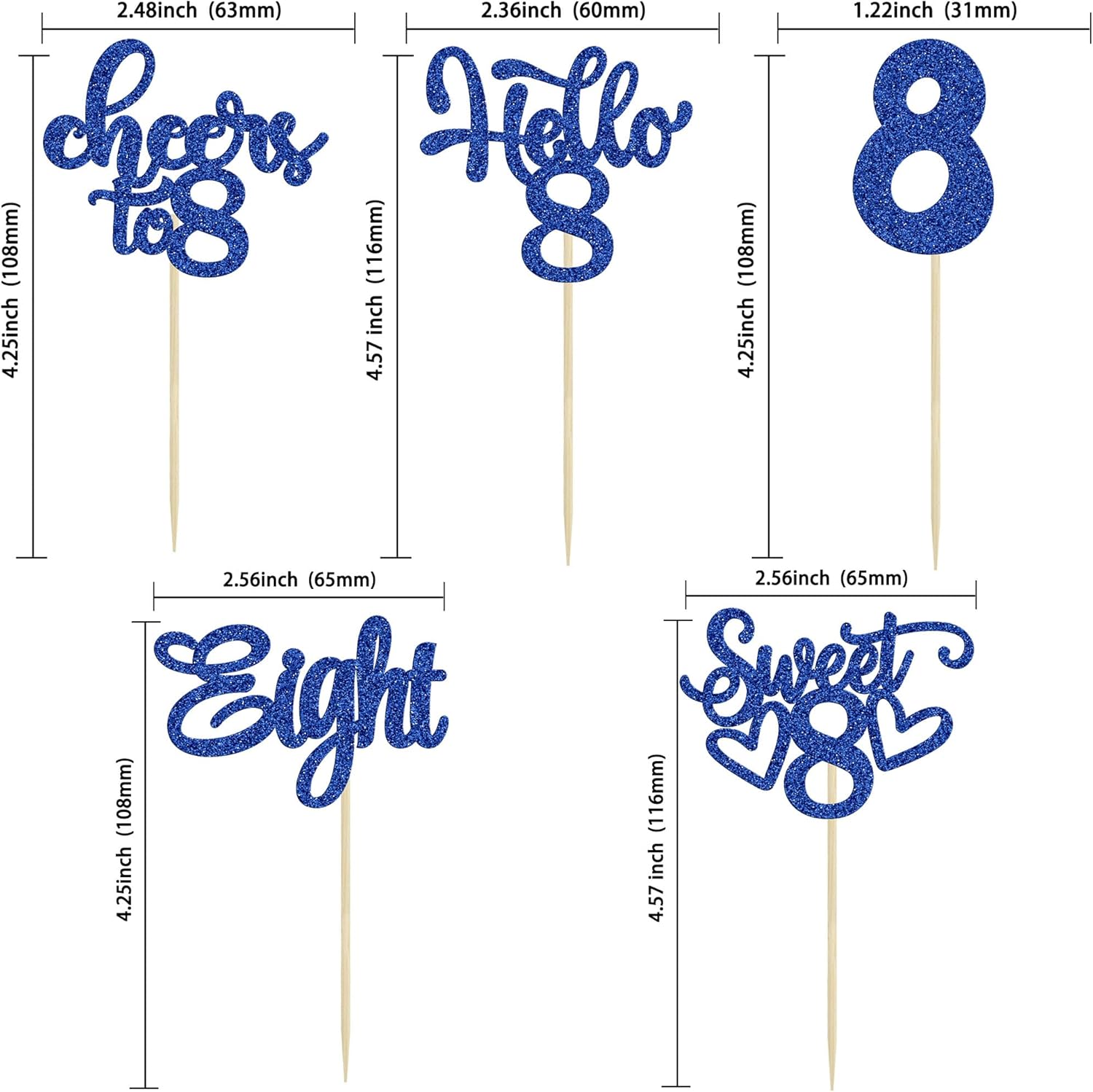 30Pcs 8th Birthday Cupcake Toppers Glitter Eight Hello 8 Cupcake Picks Cheers to 8 Years Old Cake Decorations for 8th Birthday Party Supplies Deep Blue
