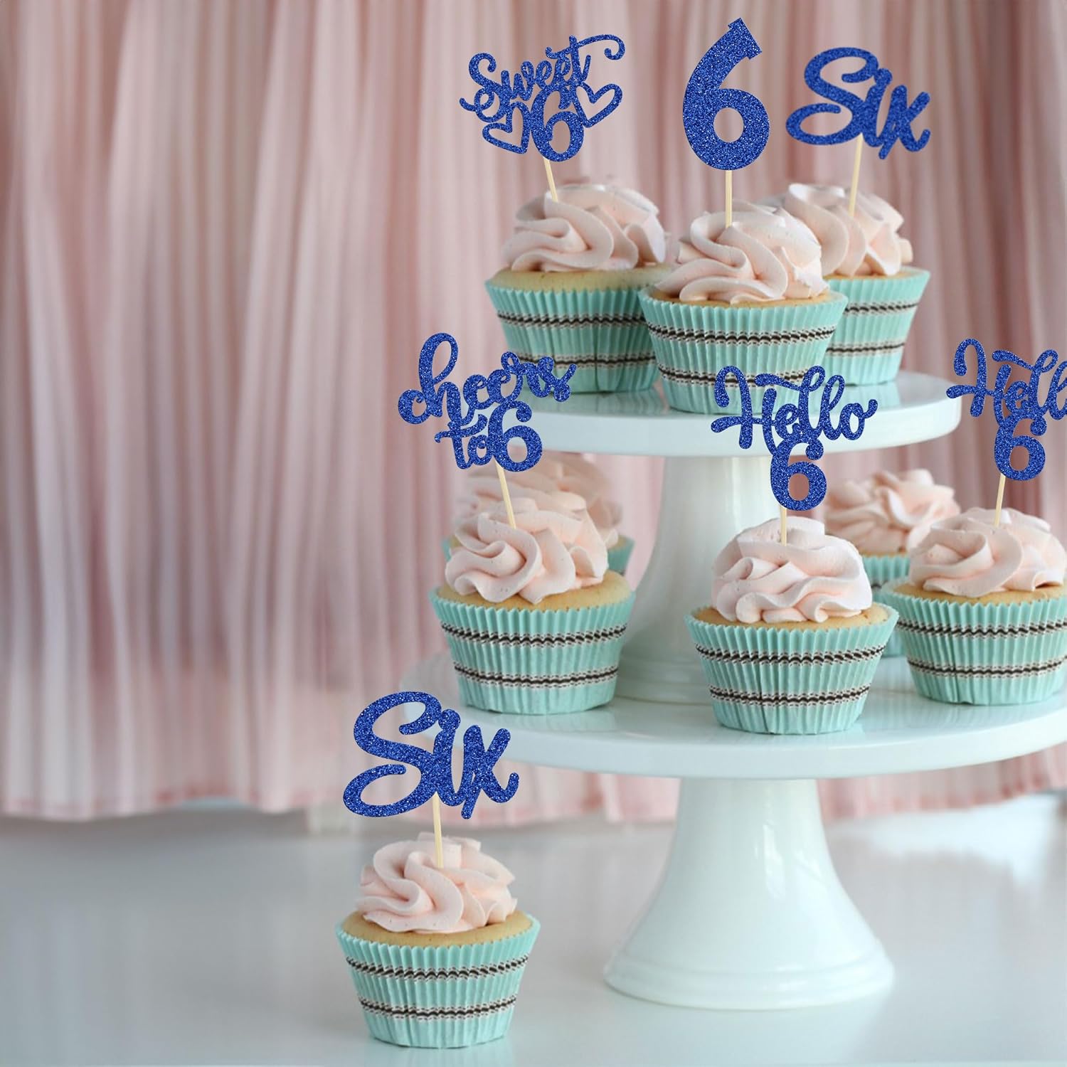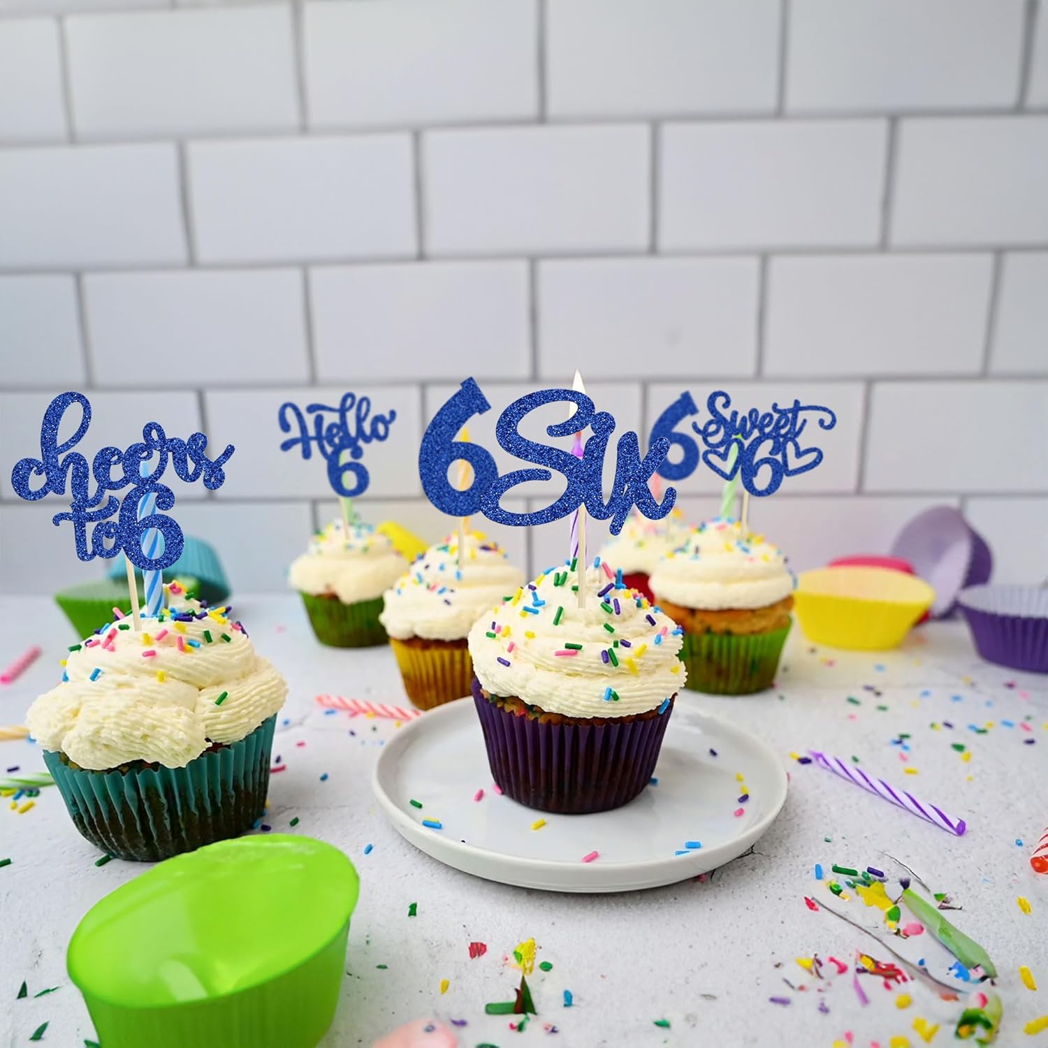 30Pcs 6th Birthday Cupcake Toppers Glitter Six Hello 6 Cupcake Picks Cheers to 6 Years Old Cake Decorations for 6th Birthday Party Supplies Deep Blue