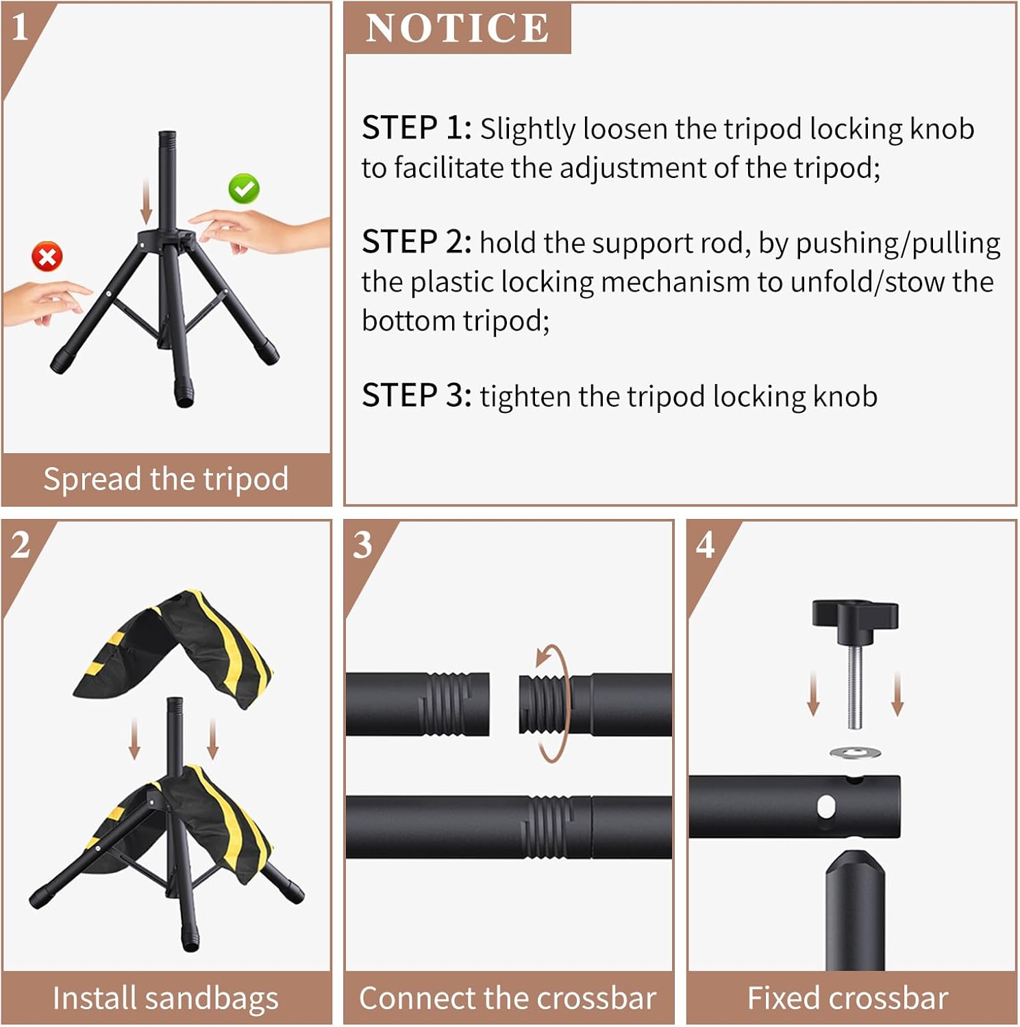 - 【Sturdy and durability】The material of the background bracket is made of high-quality aluminum alloy, which can support the weight of the background wall, you need to hold the support rod when you open the tripod base, press the plastic lock to unfold the bottom of the tripod, to prevent over-exertion of the backdrop support rod bending.