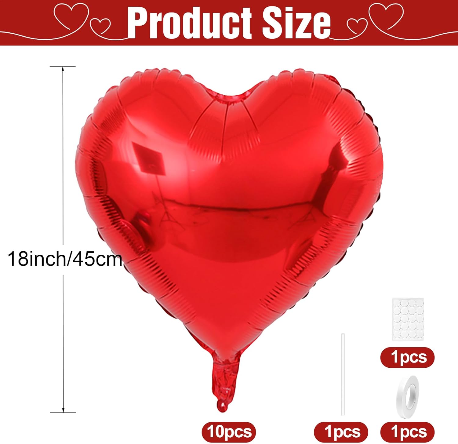 - Included Components : 10 red heart-shaped balloons, straw, ribbon