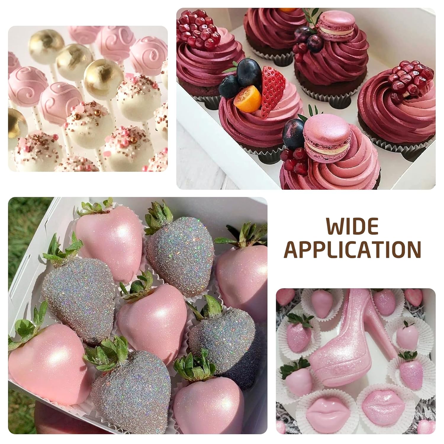 - METALLIC EDIBLE GLITTER PAINT - Specially crafted for food and baking decoration to get a metallic finish or add a gold-plated effect. All colors are brilliant and amazing. This fine texture edible cake paint can provide a high luster glitter effect to your cakes, chocolates, and candy!