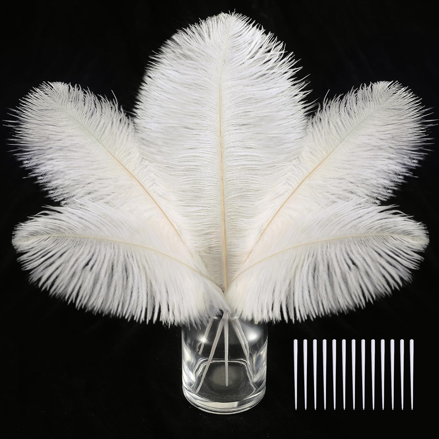 - Creative Ostrich Feathers Set: 30 pcs off white ostrich feathers bulk 6-8 inches, 30 pcs small white sticks 3 inches long. Ostrich feathers kit total length can be up to 9-11 inches