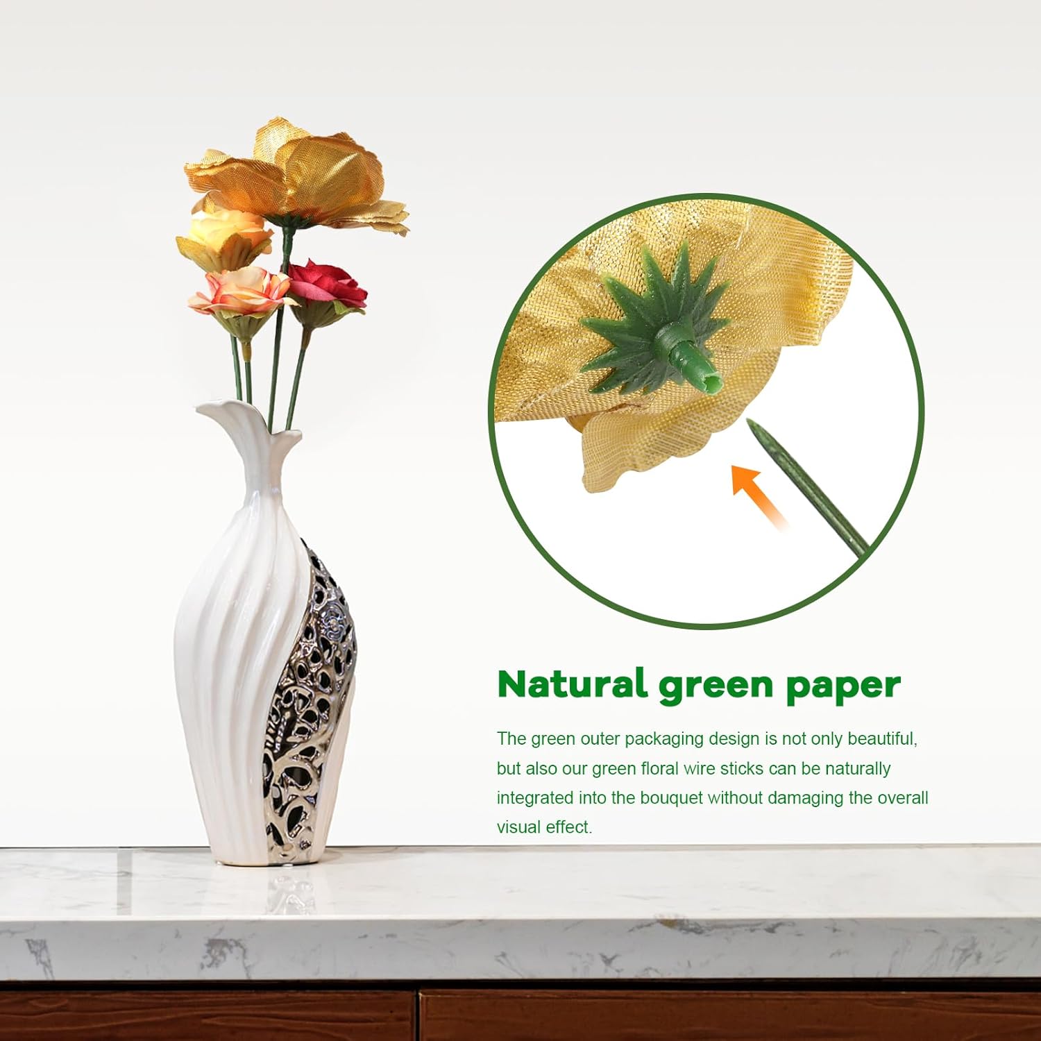 - Natural green paper: Green outer packaging design is not only beautiful, but also our green floral wire sticks can be naturally integrated into the bouquet without damaging the overall visual effect