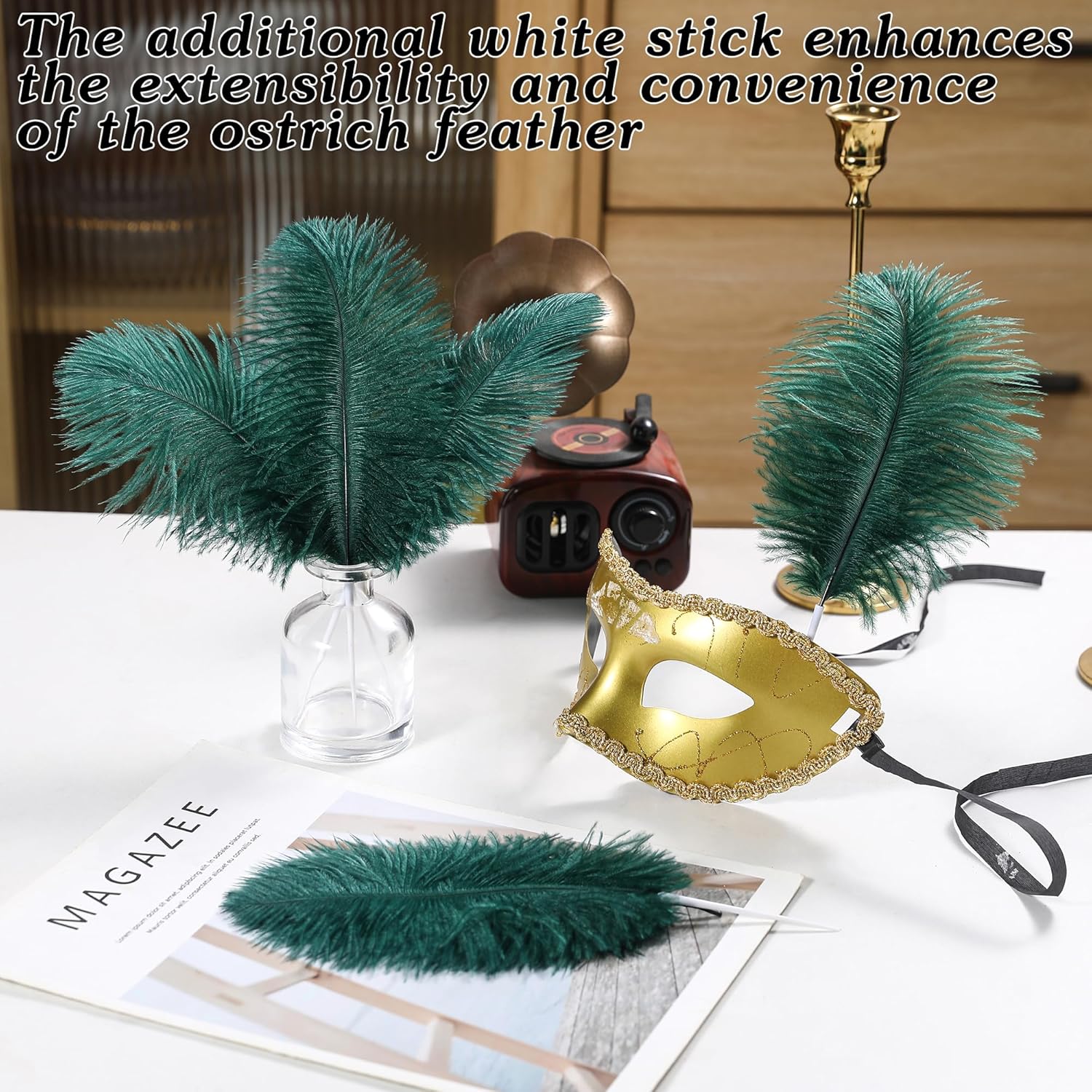- Creative Ostrich Feathers Set: 30 pcs dark green ostrich feathers bulk 6-8 inches, 30 pcs small white sticks 3 inches long. Ostrich feathers kit total length can be up to 9-11 inches