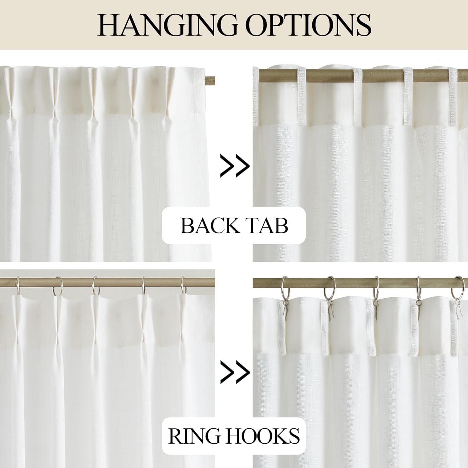 - Multiple Hanging Ways:Rustic Casual curtains have many hanging options to meet your different home décor needs:back tabs(4 inch),clip rings,ring hooks or for track system.Please note that 16 hooks are in the package but clips and rings are not included.Two weighted hems sewn at the bottom increase the draping effect.Moving the pinhooks position to adjust the total height by 1-2 inches