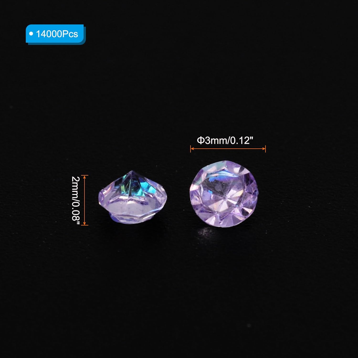 - Color: Purple AB; Material: Acrylic; Size: 3mm x 2mm/ 0.12 x 0.08 inch (Dia.x H); Packing List: 14000Pcs x Acrylic crystal diamonds