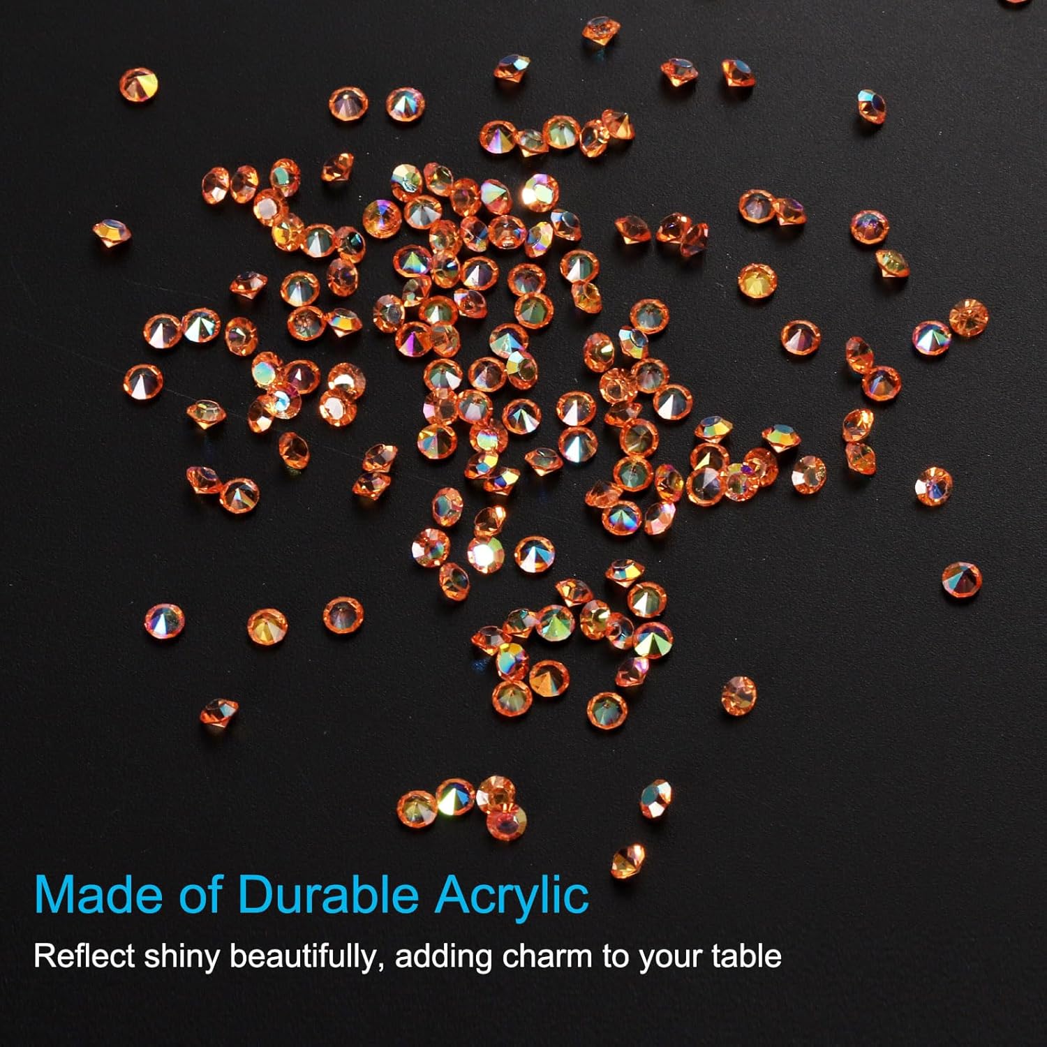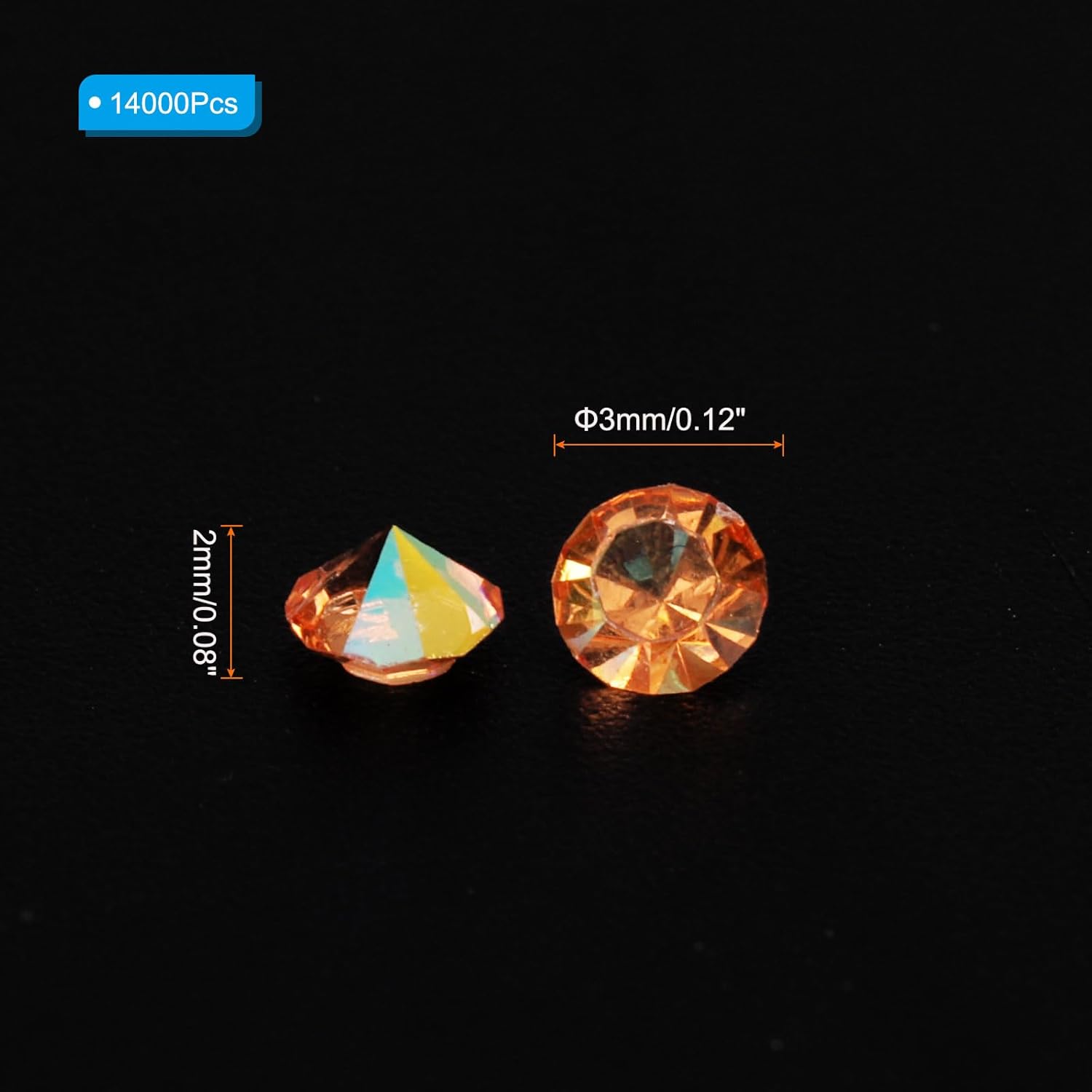 - Color: Orange AB; Material: Acrylic; Size: 3mm x 2mm/ 0.12 x 0.08 inch (Dia.x H); Packing List: 14000Pcs x Acrylic crystal diamonds