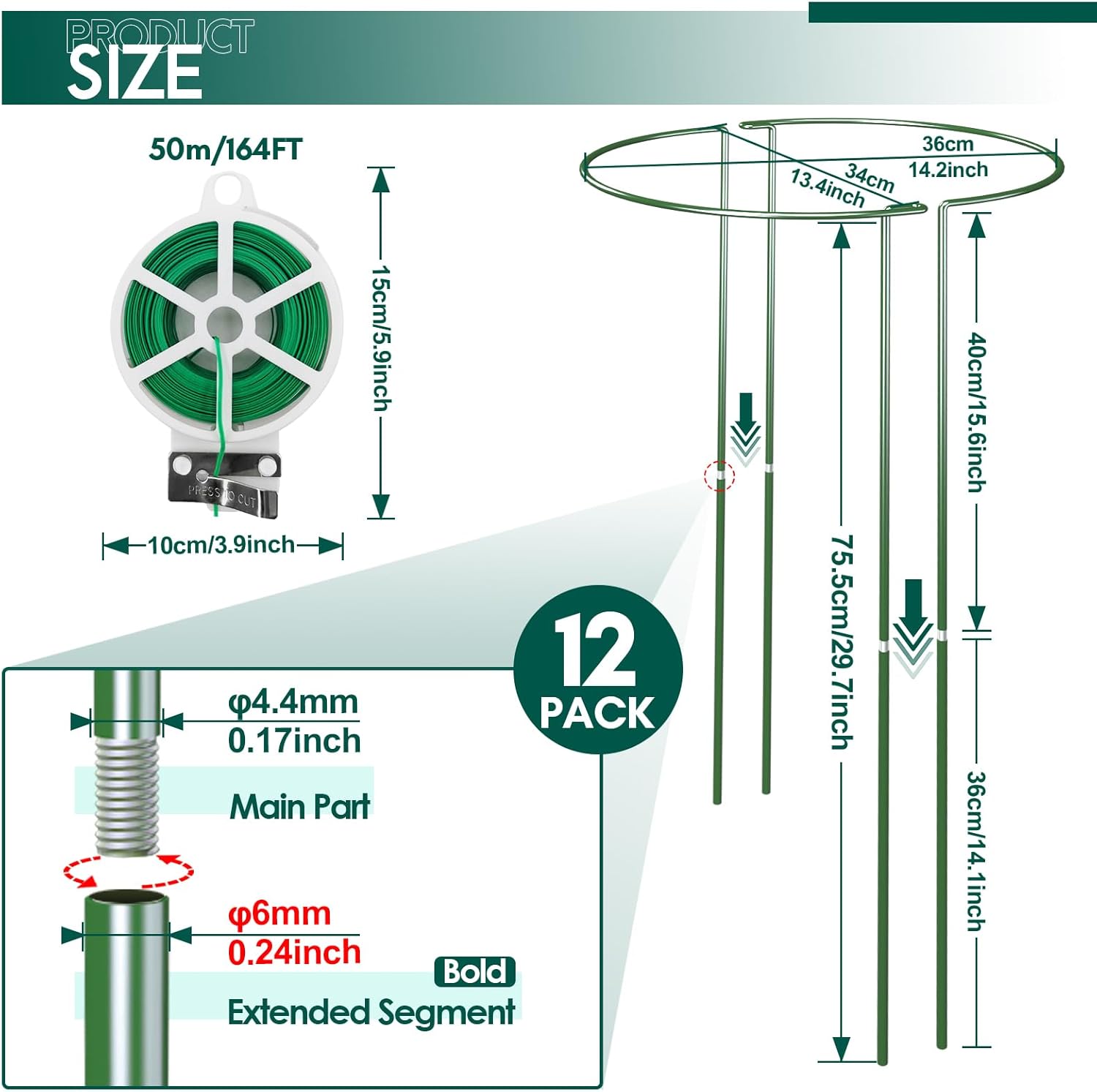 - 🍁Adjustable Plant Support Stakes: Consists of 15-inch plant supports and 15-inch stainless steel tubing 30-inch plant supports (screw the top half of the threaded wire and the bottom half of the stainless steel tubing together Iron tubing twisted together to extend the length to 30 inches high - DIY).The plant support rings are made of sturdy iron wire in 5 mm diameter with green powder coating, not easy to deform, stand firmly, well support and protect plants. they are semi-circular.