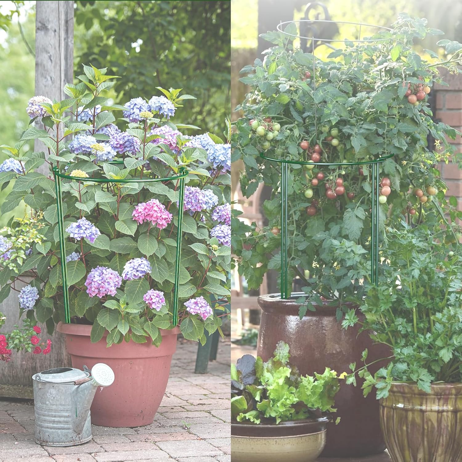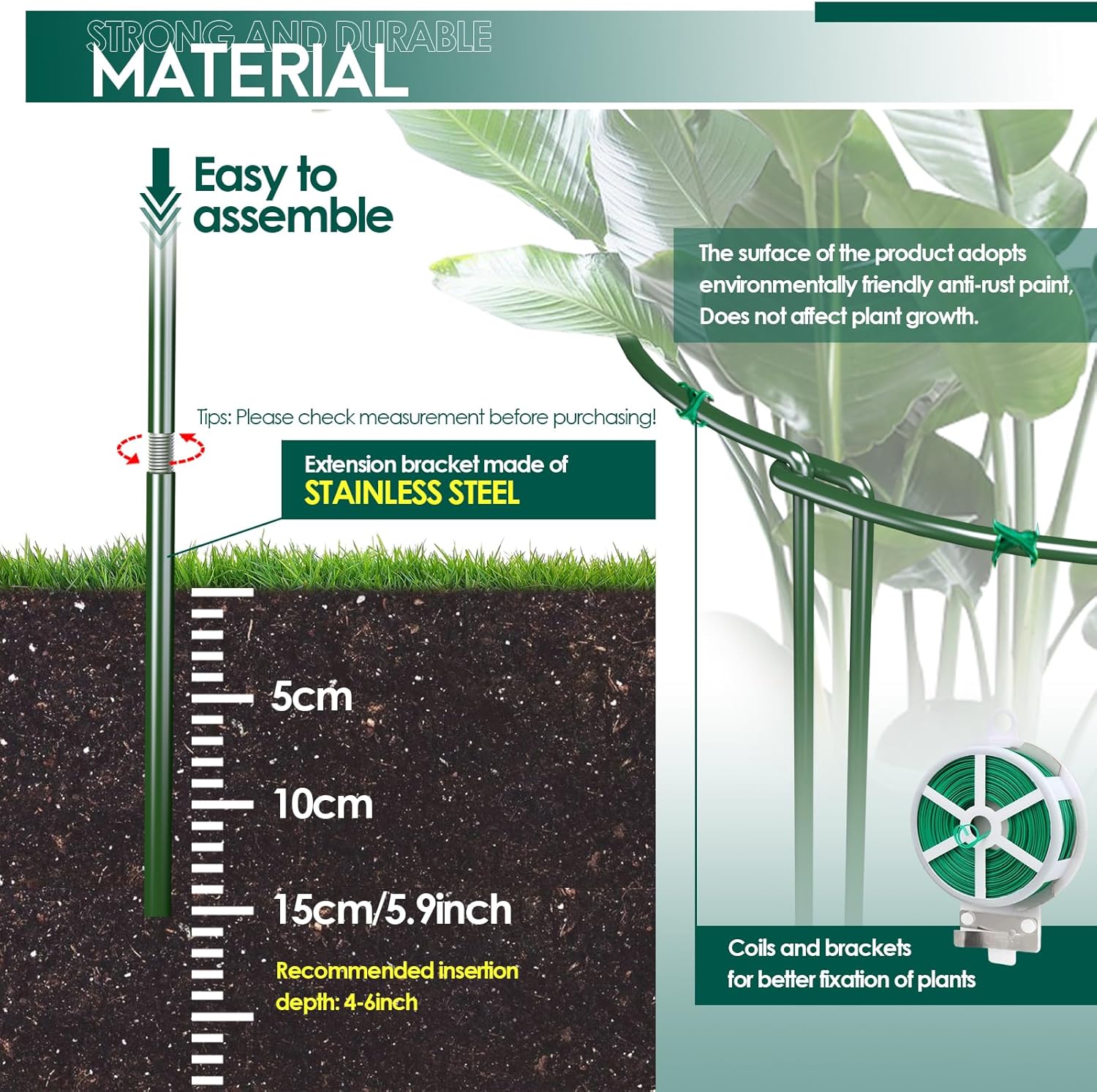- 🍁Adjustable Plant Support Stakes: Consists of 15-inch plant supports and 15-inch stainless steel tubing 30-inch plant supports (screw the top half of the threaded wire and the bottom half of the stainless steel tubing together Iron tubing twisted together to extend the length to 30 inches high - DIY).The plant support rings are made of sturdy iron wire in 5 mm diameter with green powder coating, not easy to deform, stand firmly, well support and protect plants. they are semi-circular.