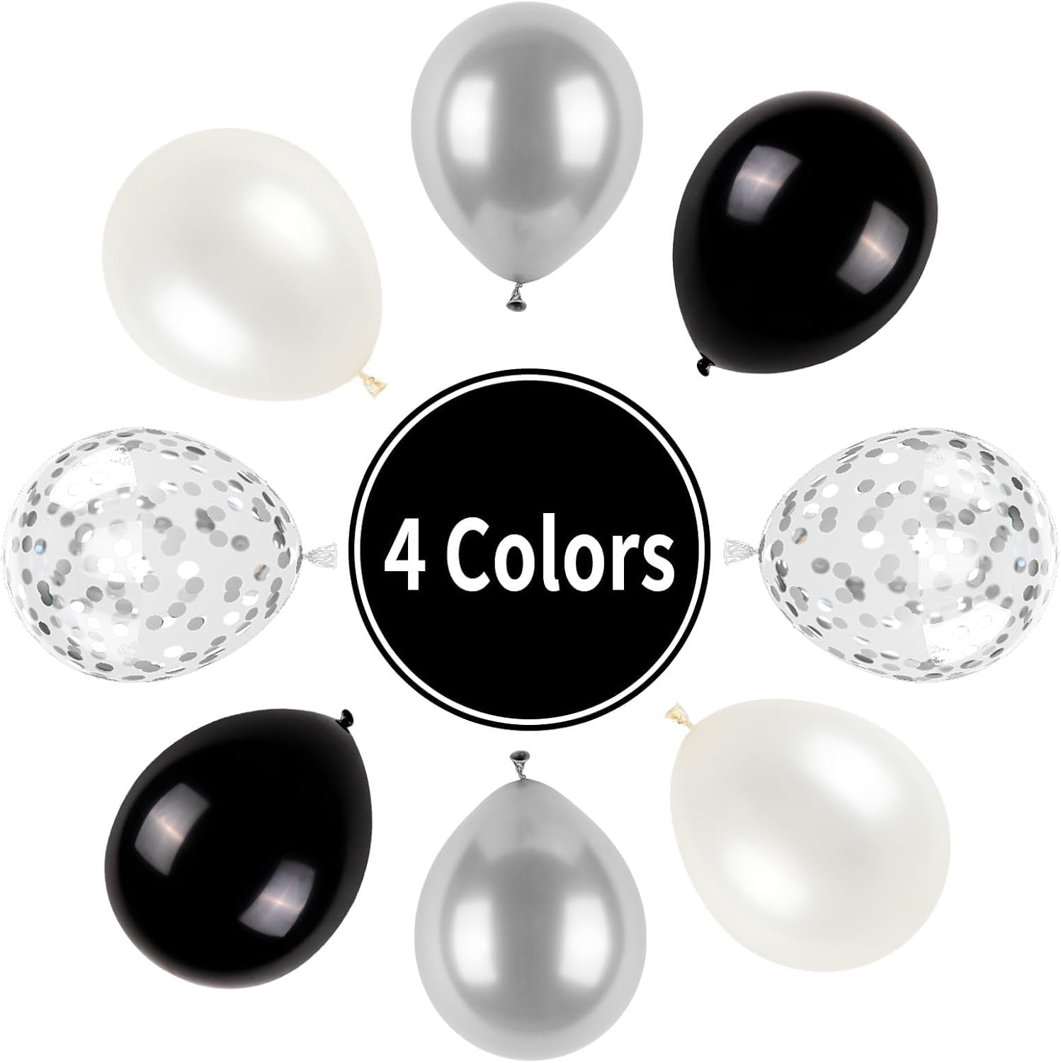 - 【12Inch Party Balloons Set】: The black and silver balloons set includes 20pcs matte black balloons, 10pcs metallic silver balloons, 15pcs silver confetti balloons, 15pcs pearl silver balloons, 1pc silver ribbon. 61pcs in total. Elevate your celebrations with our birthday party balloons!