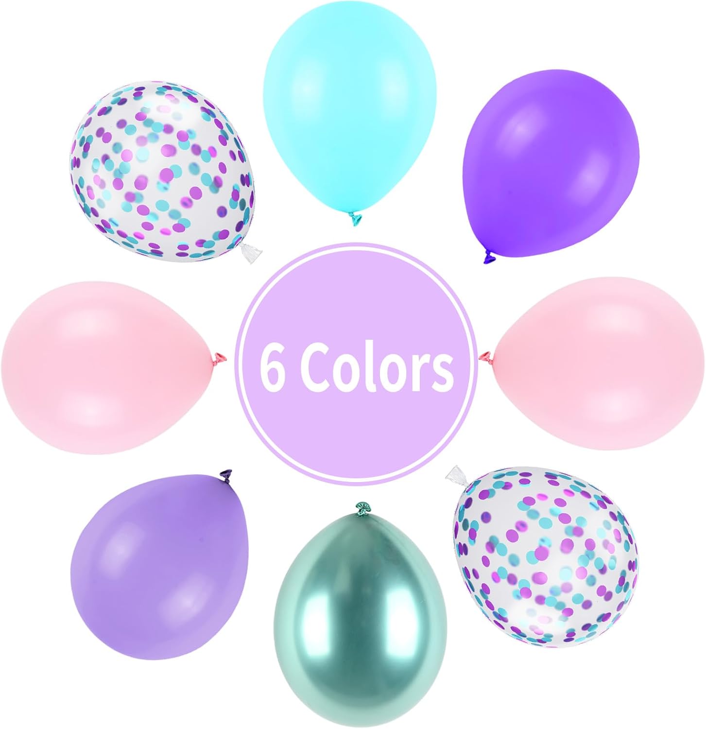 - 【12Inch Party Balloons Set】: The mermaid balloons set includes 10pcs purple balloons, 10pcs retro taro purple balloons, 12pcs pastel teal balloons, , 8pcs metallic green balloons, , 12pcs pastel pink balloons, 8pcs blue purple confetti balloons, 1pc silver ribbon. 61pcs in total. Elevate your celebrations with our birthday party balloons!