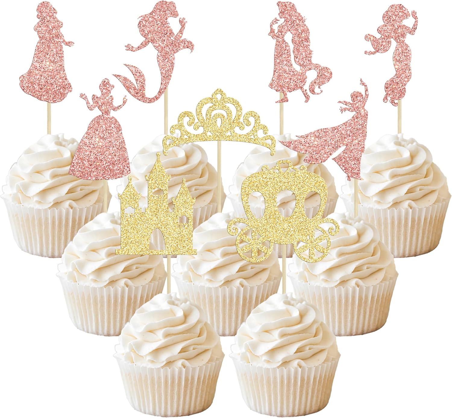 Gyufise 36Pcs Princess Cupcake Toppers Glitter Mermaid Girl Castle High Heel Crown Cupcake Picks Princess Theme Baby Shower Girls Birthday Party Cake Decorations Rose Gold