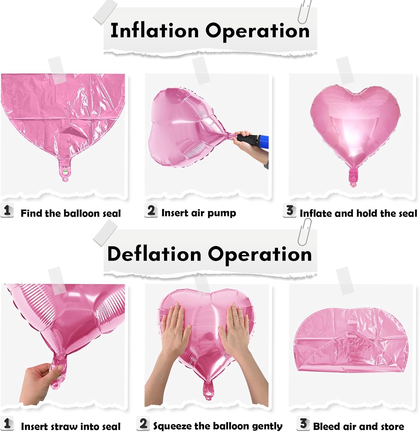 - Easy to Use: The heart foil can inflate with helium or air, can be self-sealed. It is recommended to inflate to 85%-90% to prevent the balloon from bursting.