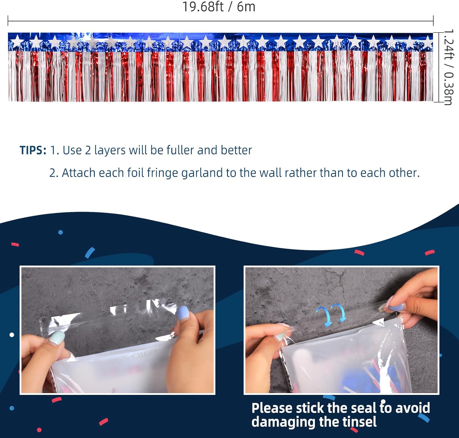 - 🗽 PACKAGE INCLUDES: 2 Packs red white and blue star foil fringe garland / metallic tassel banner, each garland is 1.24 feet wide * 19.68 feet long, perfect 4th of July decorations.