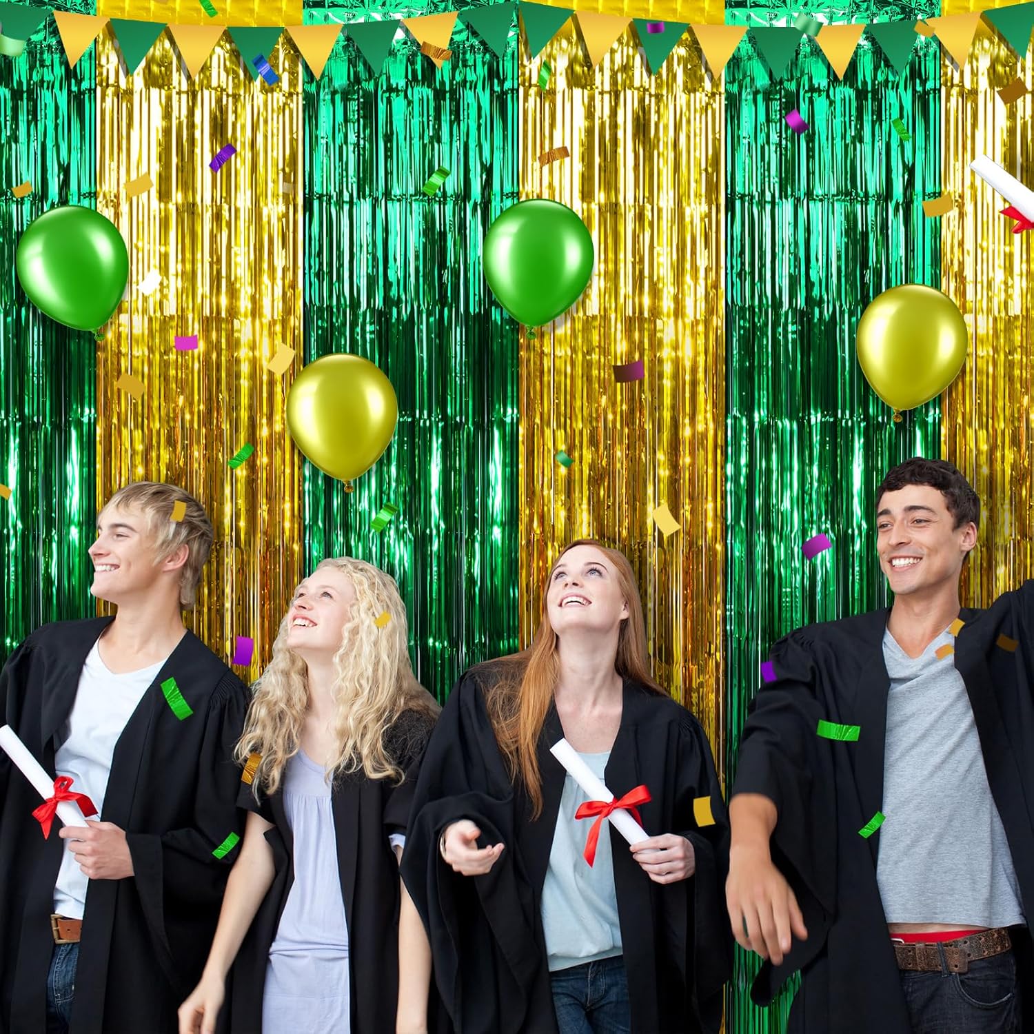 - What’s Inside: Included in the package are 3 green and gold fringe curtains, each measuring 3.3 x 6.6 ft, making them suitable for decorating most scenes. Perfect for graduation parties, these curtain backdrops will add a pop of color to your gathering and help evoke fond memories.