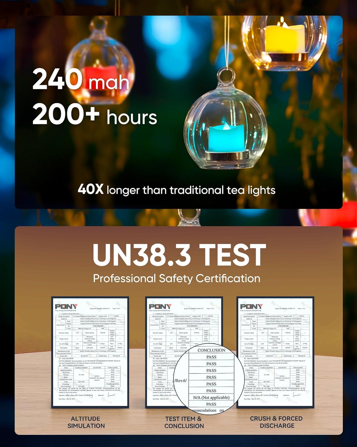 - RELIABLE & SECURE: Homemory LED tea lights are tested rigorously, ensuring their reliability. With (UN38.8) internationally certified batteries and healthy polypropylene materials, plus a secure battery cap design, we care about your safety