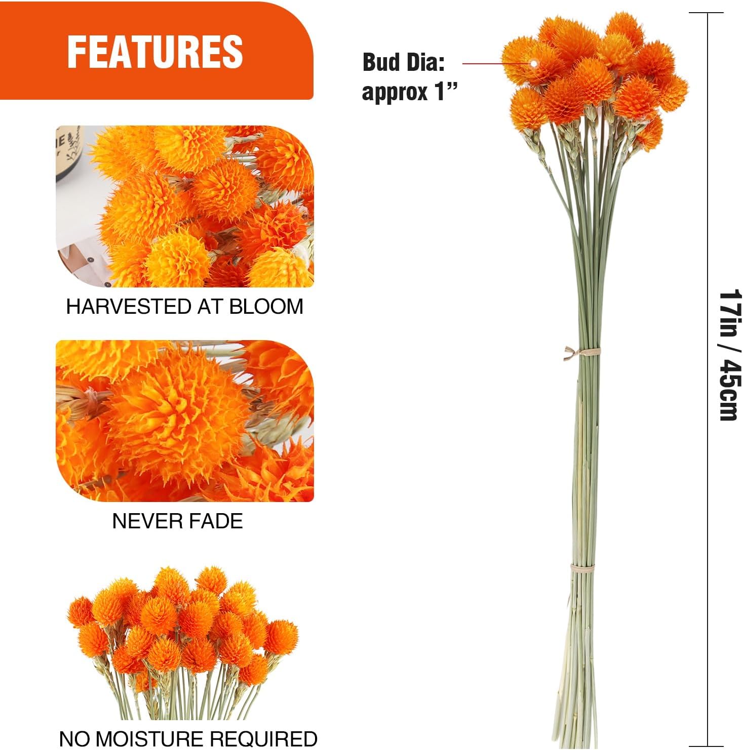 Dried Globe Amaranth Flower with Wheat Straw Natural - 40PCS Bouquet for Vase Home Decor Party DIY Arrangement (Orange)