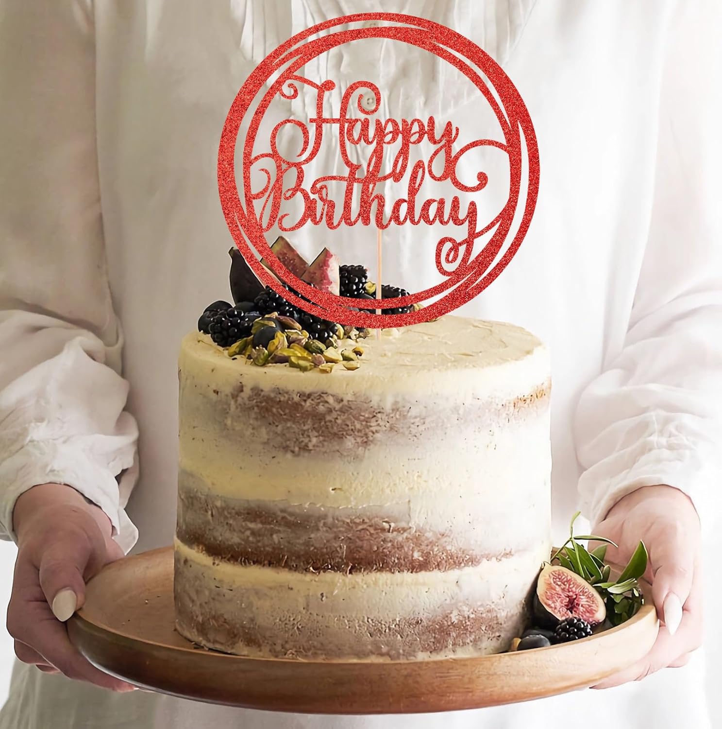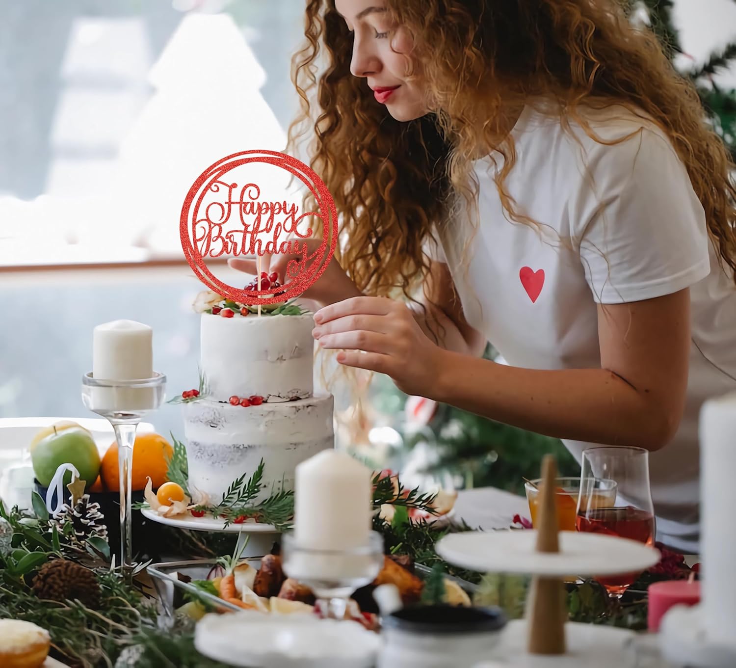 Happy Birthday Cake Topper - Red Glitter Happy Birthday Cake Decoration Supplies for Children or Adults - Happy Birthday Cake Bunting Decor, Photo Booth Props