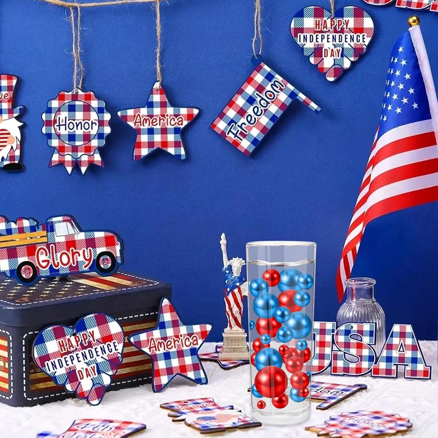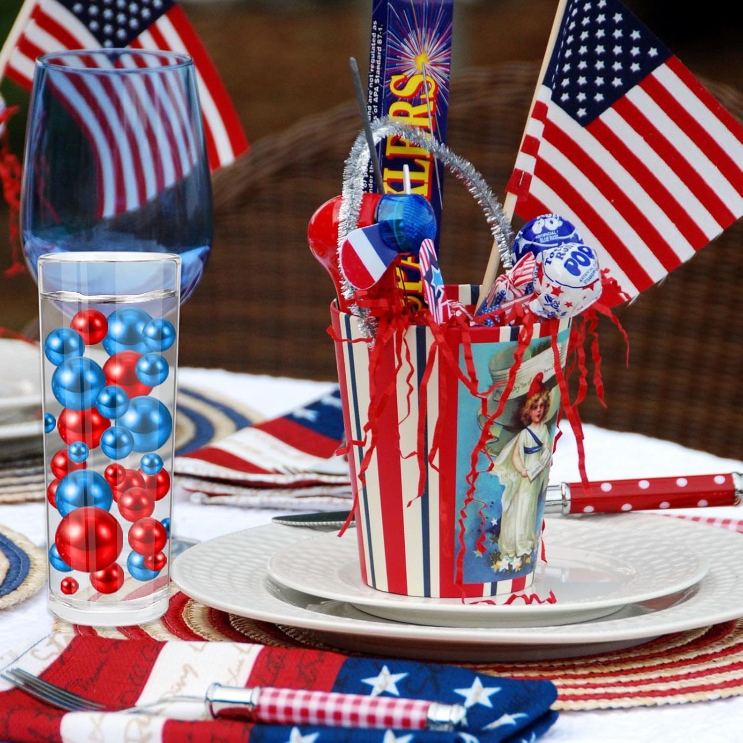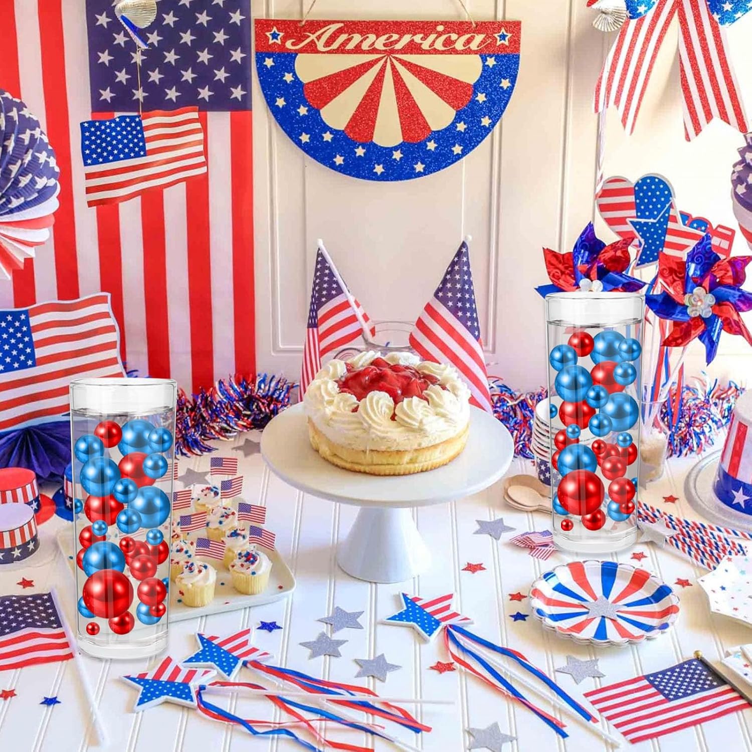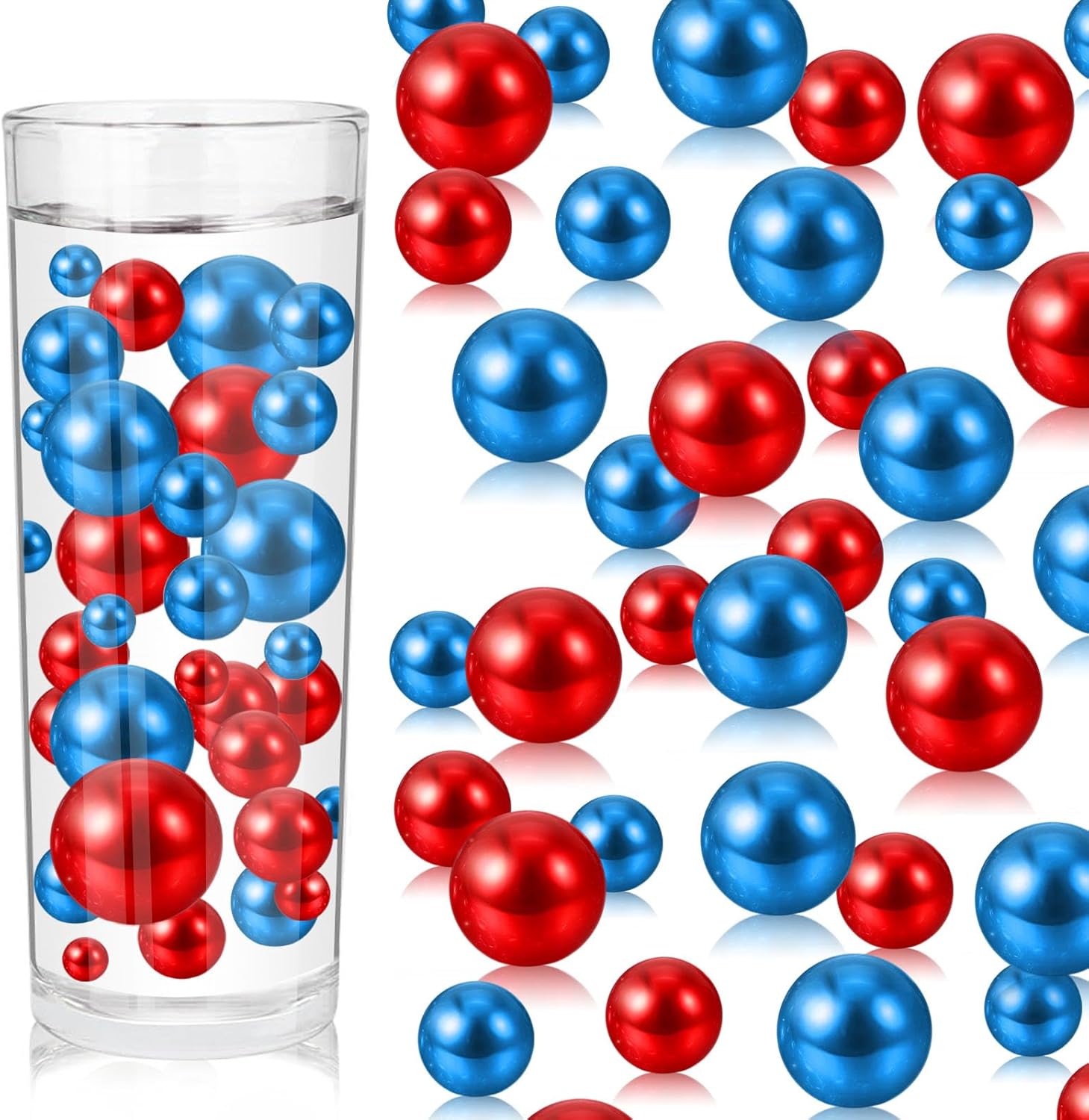 100PCS Red Blue Faux Pearls Beads for Centerpiece Vases, Vase Filler Faux Pearls, No Holes Filler Beads for Independence Day Party Anniversary Fourth of July Table Decor, 14/20/30mm