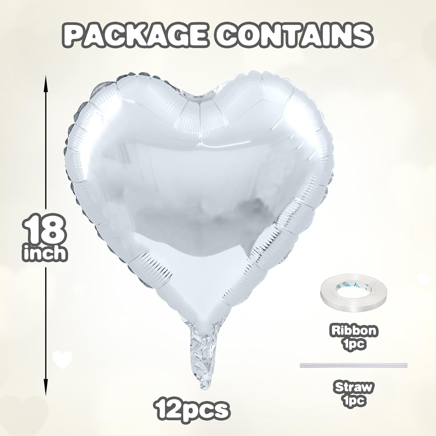 12 Pcs Heart Balloons, 18 inch Silver Heart Shaped Balloons, Big Foil Helium Balloon, Love Foil Balloon for Wedding Baby Shower Anniversary Backdrop Valentine Party Decorations