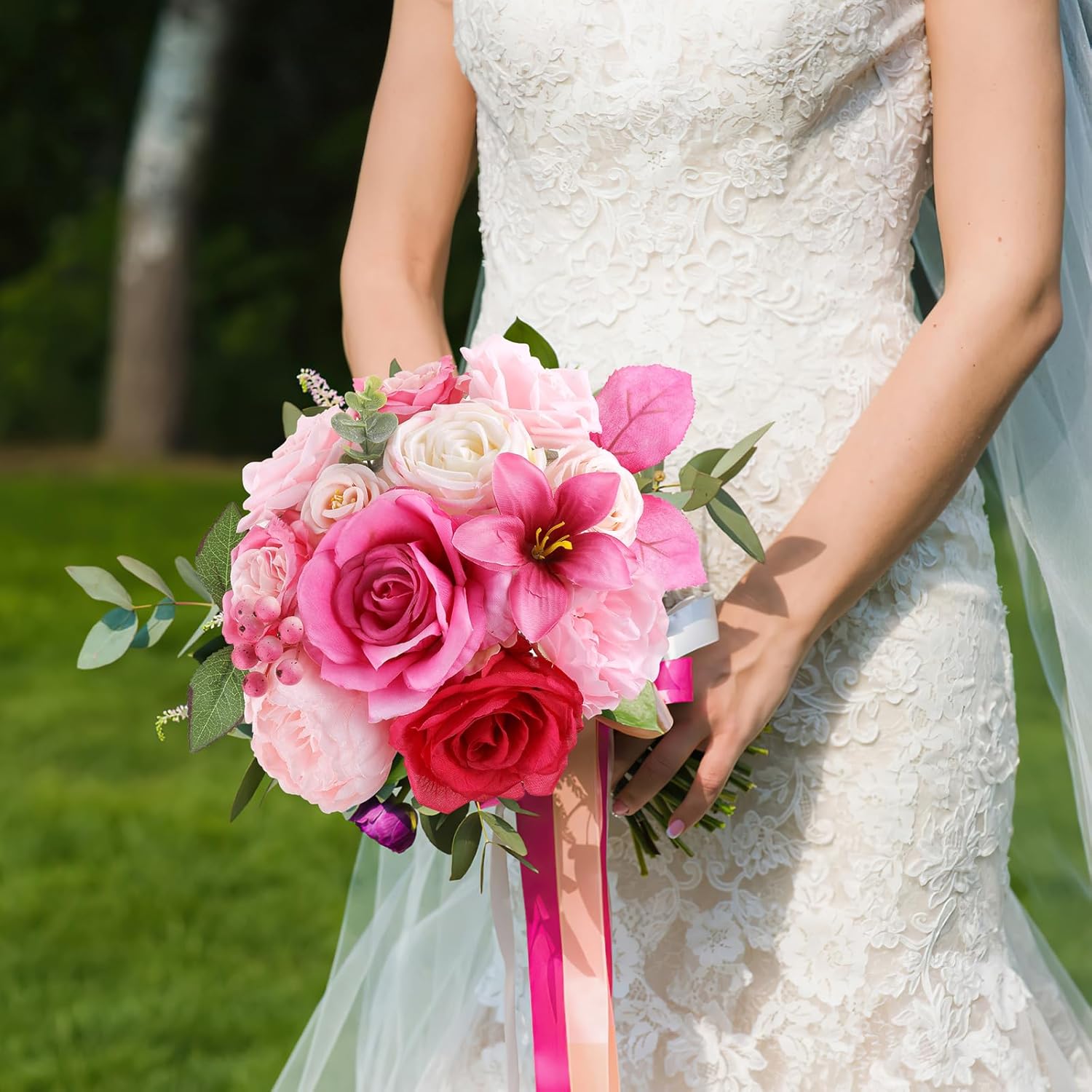 AmyHomie Fuchsia Pink Artificial Flowers Combo Silk Mix Peony Rose Fake Flowers w/Stem for DIY Wedding Bouquets Centerpieces Arrangements Table Fall Decor Party Bridal Baby Shower Home Decorations