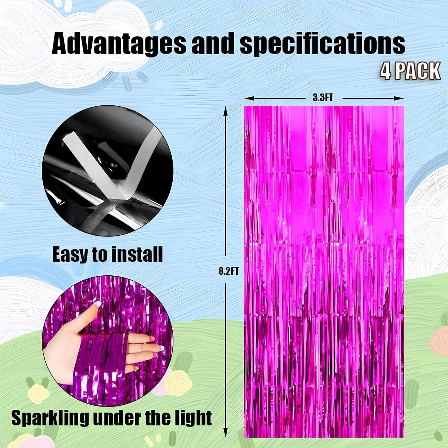 - 4 Pack foil fringe tinsel backdrops: each measuring a whopping 3.3 ft x 8.3 ft.Long enough for indoor or outdoor parties. Also can be cut in suitable length for your birthdays Party decorations These backdrops are perfect for creating stunning party decorations, event backdrops, and photo booths that will leave your guests in awe.