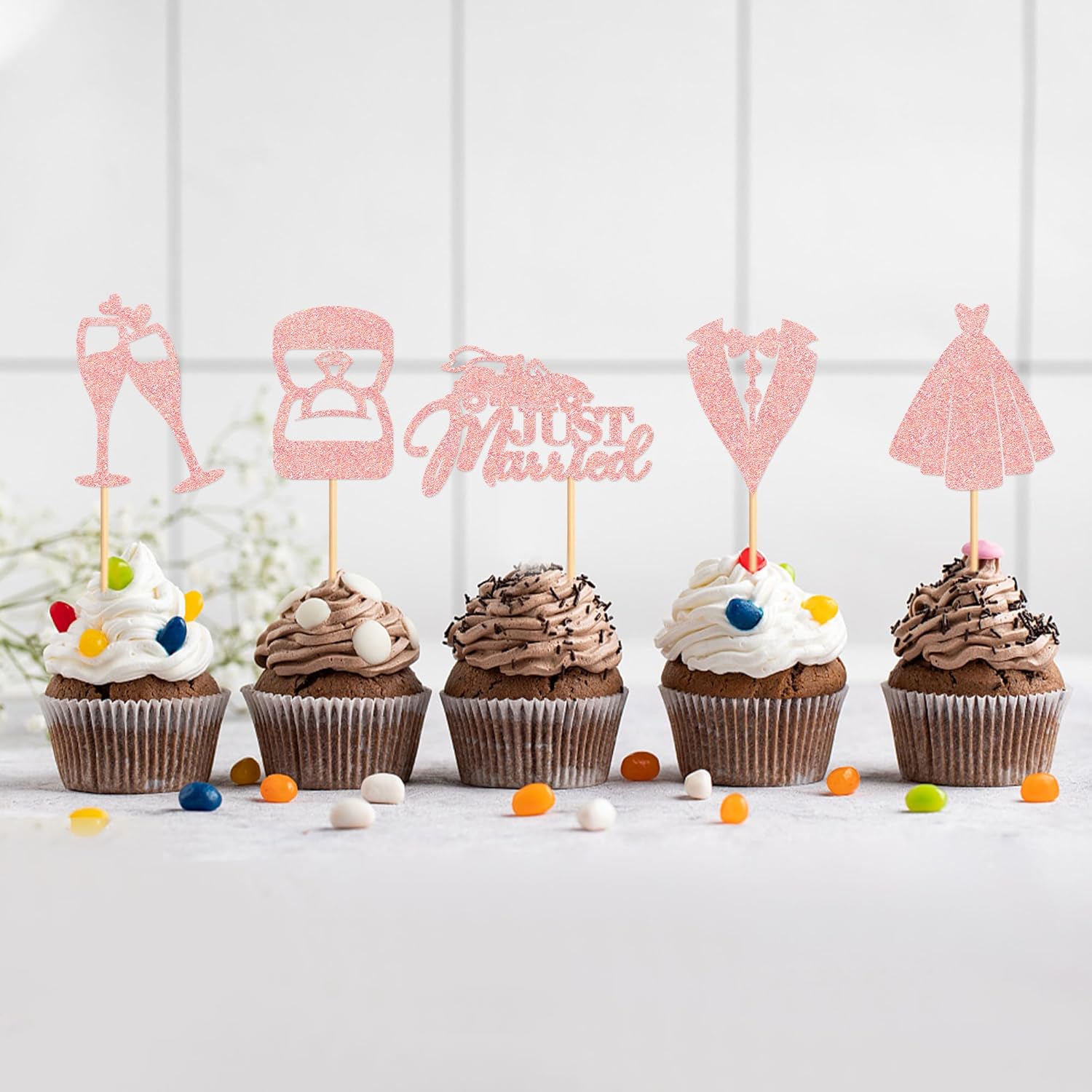 25 Pcs Bride and Groom Cupcake Toppers Wedding Dress Diamond Ring Cupcake Picks Bridal Shower Wedding Engagement Anniversary Party Cake Decorations Supplies Rose Gold