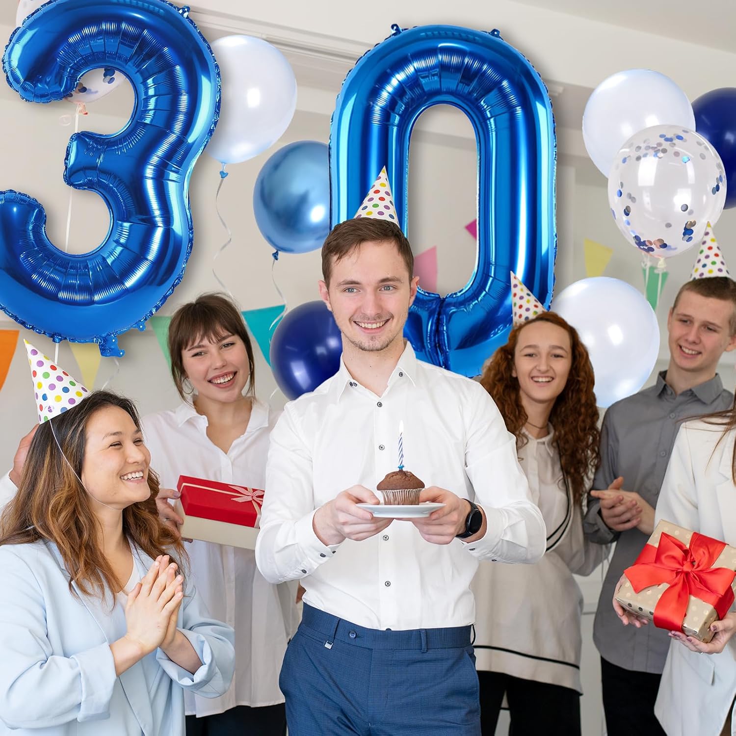 - 💓 Dark Blue Number 30 Balloon: Our package included 40 inch foil number 30 balloon(2pcs), 12 inch metallic blue balloon(4pcs), blue silver confetti balloon(4pcs), pastel blue balloon(4pcs), Light Navy Blue Balloon(2pcs), 1pcs straw and 1 roll ribbon. Simply inflate the balloon using the straw, and you're ready to party! Navy blue number foil balloons are the best for men or women birthday party decoration.