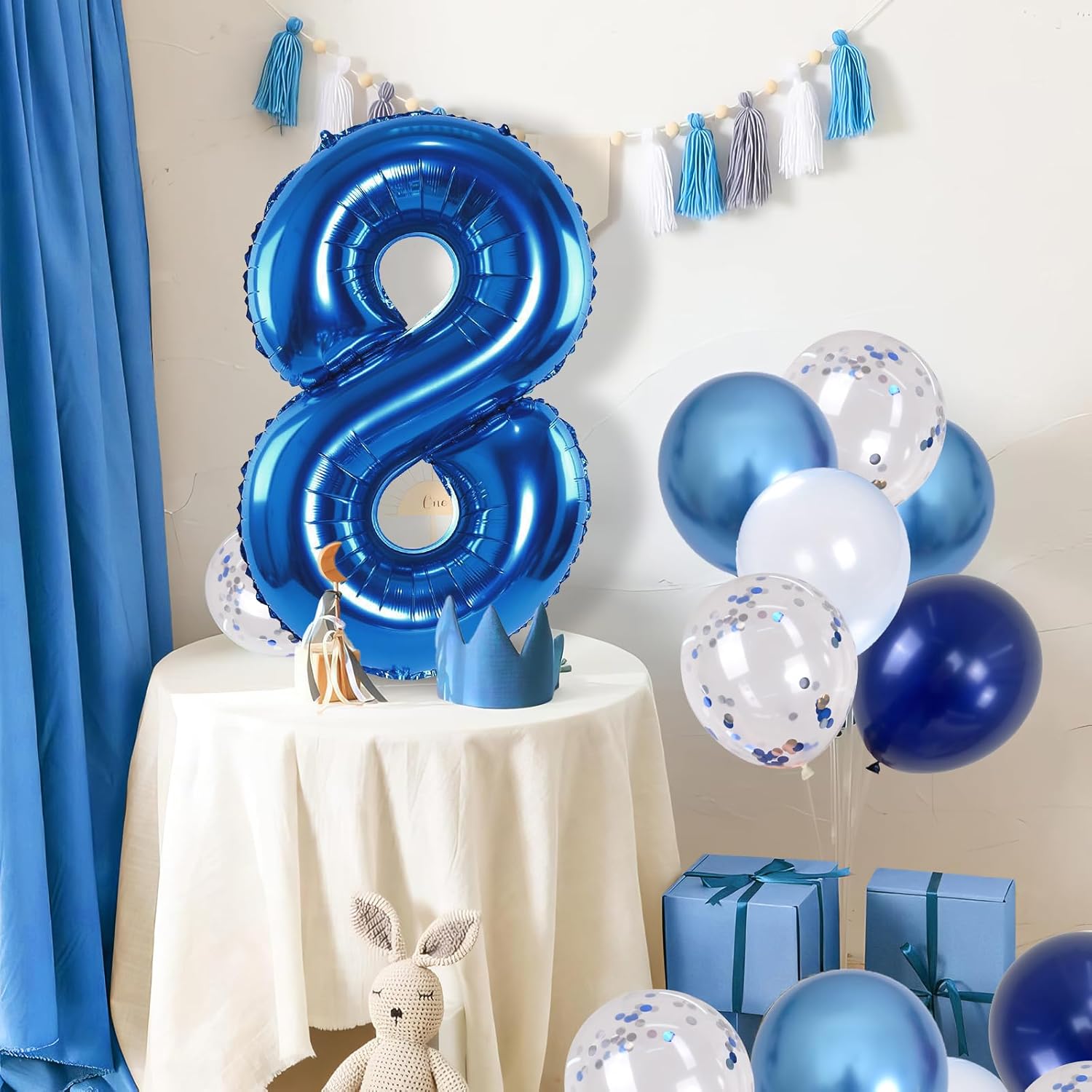 - 💓 Dark Blue Number 8 Balloon: Our package included 40 inch foil number 8 balloon(1pcs), 12 inch metallic blue balloon(4pcs), blue silver confetti balloon(4pcs), pastel blue balloon(4pcs), Light Navy Blue Balloon(2pcs), 1pcs straw and 1 roll ribbon. Simply inflate the balloon using the straw, and you're ready to party! Navy blue number foil balloons are the best for girls or boys birthday party decoration.