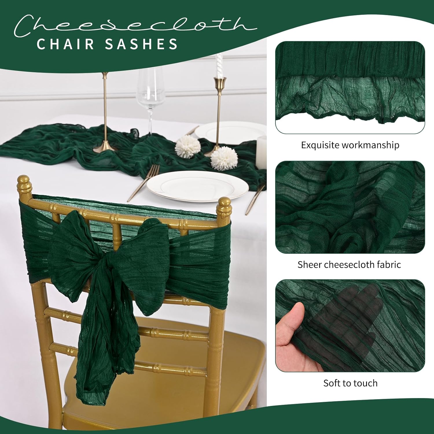 - 【Delicate Craftsmanship】Emerald Green cheesecloth chair sashes adopt unique pleated workmanship, and the overall appearance is simple and elegant, creating an elegant and romantic atmosphere easily. The edges are carefully stitched to keep a perfect flowing condition, will not get broken or loose easily, can serve you for a long time