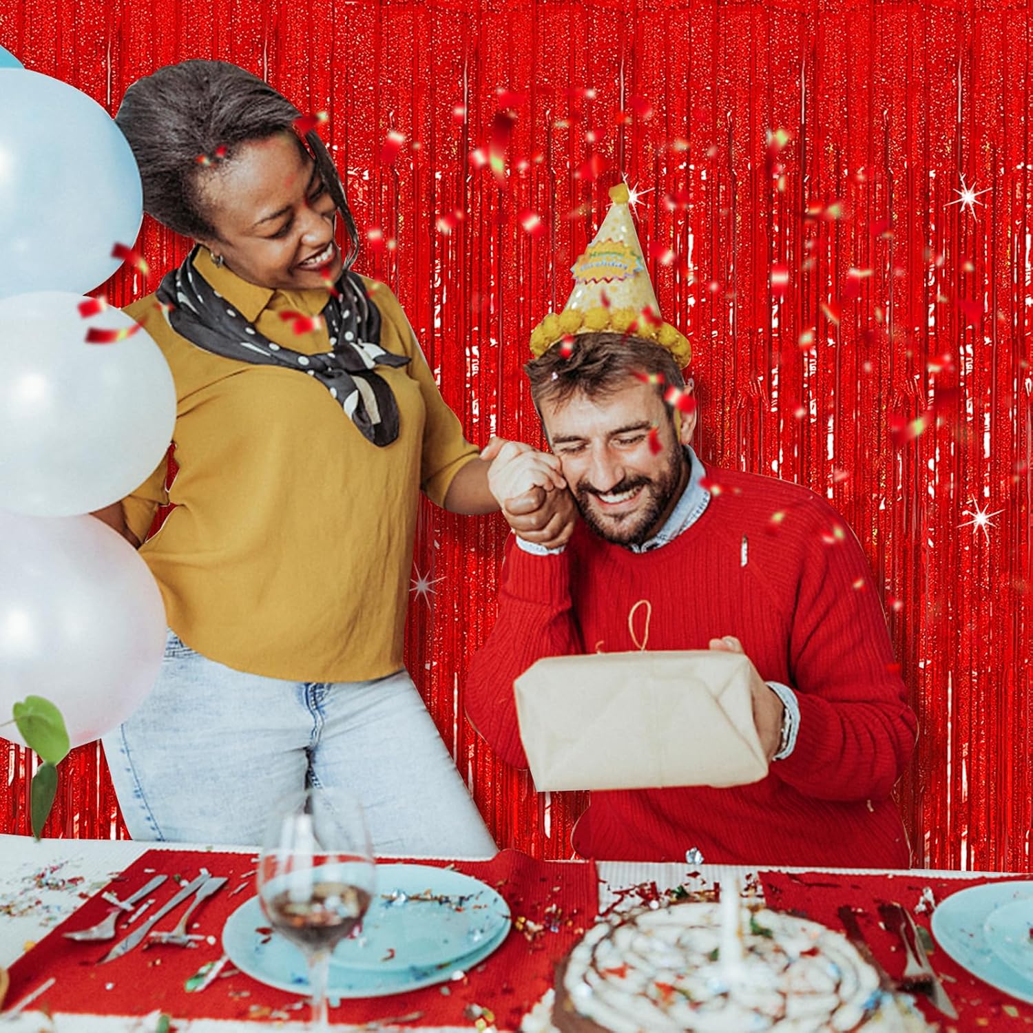 - Red Streamers Backdrop Curtain:The back of fringe curtain has double-sided tape, which can be stuck very firmly to any place you want such as walls, tables, door frames. You can use scissors to cut the length you want, and you can use two or more pieces of the curtain to splice and overlap.