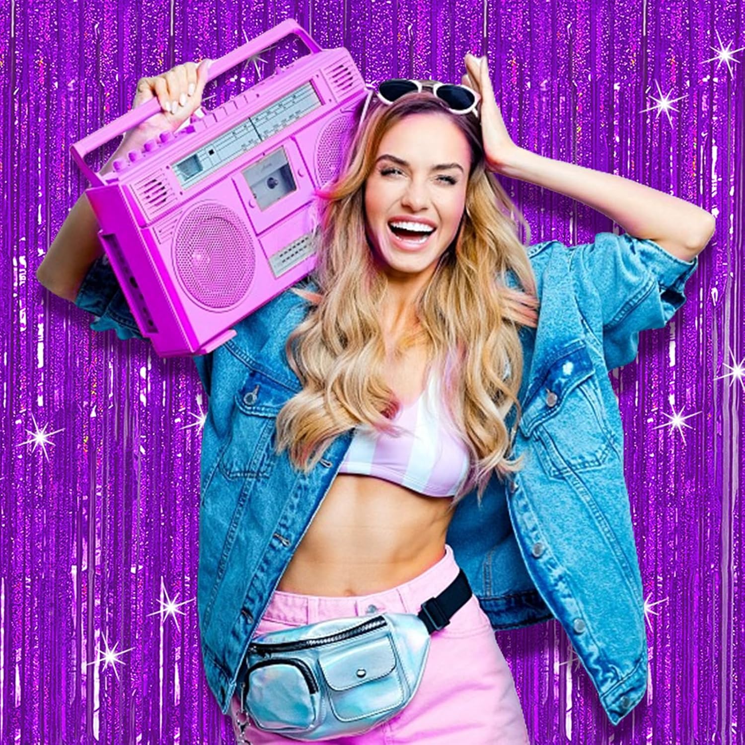 - Purple Party Decorations:3 packs of foil fringe curtains, the size of the foil curtain is 3.28 ft x 6.56 ft.It's long enough to fit any occasion. Please do not stick the foil curtain on uneven or stained walls to prevent it from falling off.