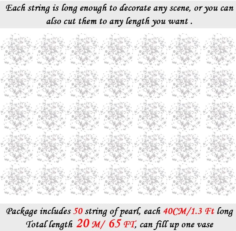 - String of Pearls: You will receive 50 pieces of pearl string (1.3 feet each) total 65 feet of pearls, artificial string beads strand, each strand consists of some large beads and small beads, the beads string are available in two sizes of 10mm and 5mm, the quantity is enough to satisfy your different decorative and DIY needs and party use needs, the pearl string beads are suitable for floating candles water centerpiece and wedding centerpieces, make your space full of elegance and modern style