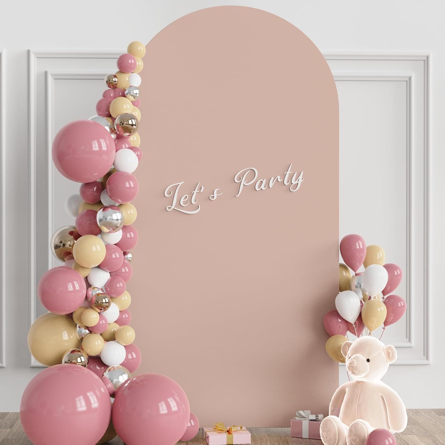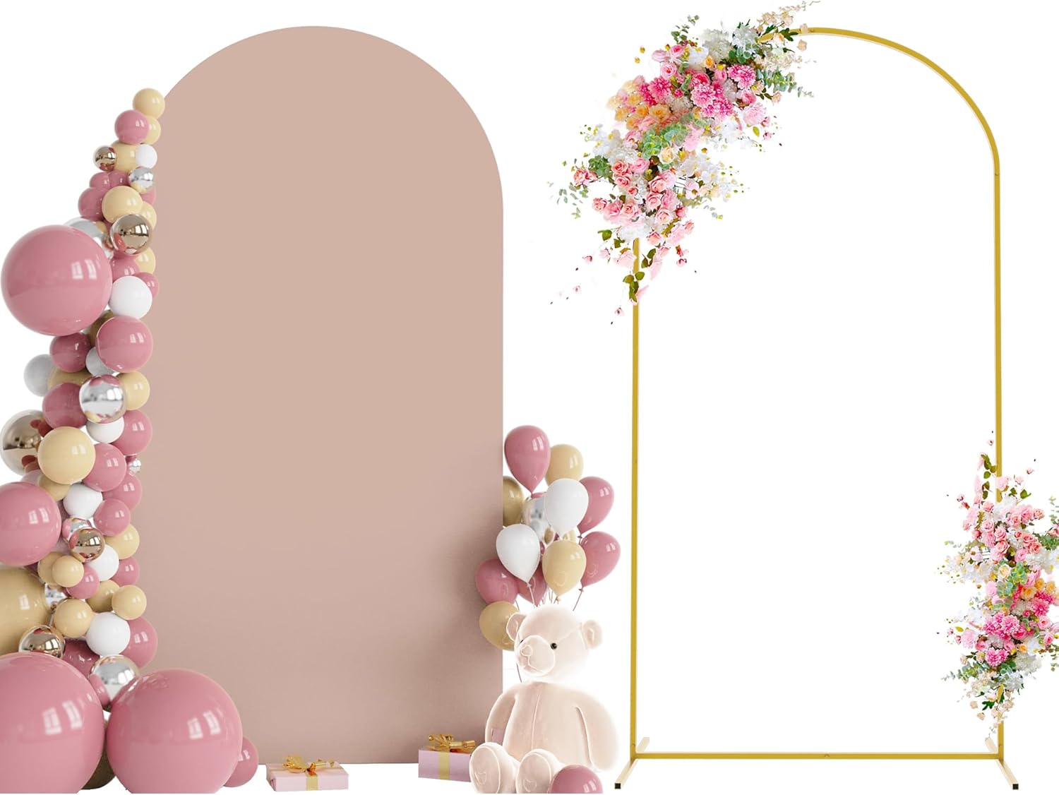 - 【Arch Stand and Covers Package】Package contains 1pcs wedding arch stand and 1pcs arch cover. Size: 6.6x3.3ft(HxW). Material: metal arch backdrop stand and spandex arch cover. Color: Nude Pink arch cover and gold wedding arch stand. Decorate your party with our gold arch stand and arch covers to create an epic decor for your celebration.