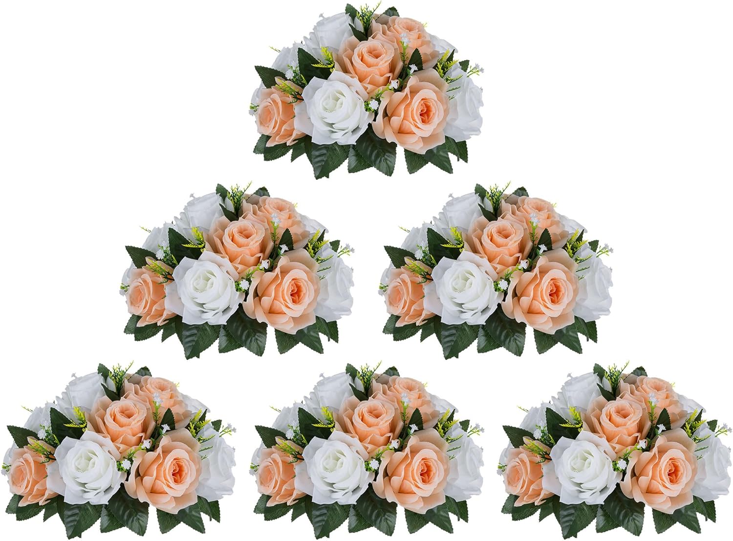 BLOSMON Rose Flower Balls Centerpieces: 6pcs 9.5 Inch Peach Fuzz Fake Flowers Kissing Balls Decor Artificial Wedding Floral Arrangements Silk Bouquet with Base Home Party Room Table DIY Decorations