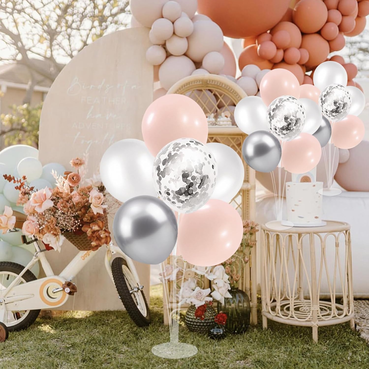 - WHAT INLCUDE: This balloon stand kit include 4 set balloon holders, 35pcs balloons - pink and white balloons, silver and silver confetti balloons, balloon pump, ribbons, glue dots and tie tool